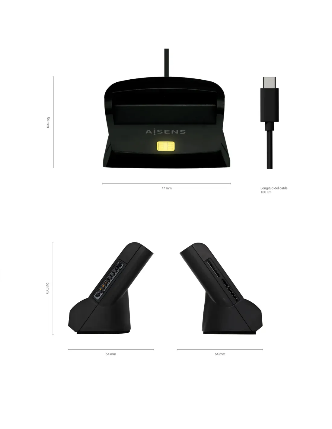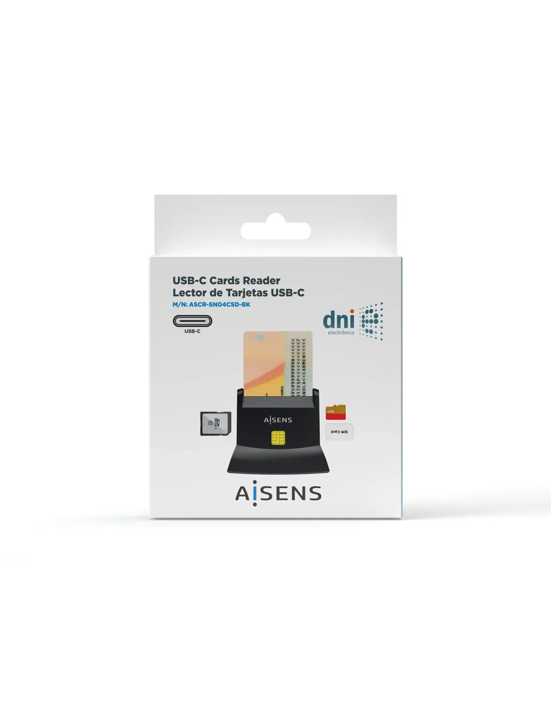 AISENS Lector De Tarjeta Dni Con Lector De Tarjetas SIM, SD, Micro SD, MMC, RS-MMC, MMC Micro, USB-C, Negro. Tarjetas de memoria compatibles: MMC, MMCmicro, MicroSD (TransFlash), SD, Conexión a PC: USB 2.0. Ancho: 77 mm, Profundidad: 54 mm, Altura: 54 mm. Ancho del paquete: 98 mm, Profundidad del paquete: 39 mm, Altura del paquete: 103 mm. Cantidad por caja: 108 pieza(s), Ancho de la caja principal: 510 mm, Longitud de la caja: 345 mm