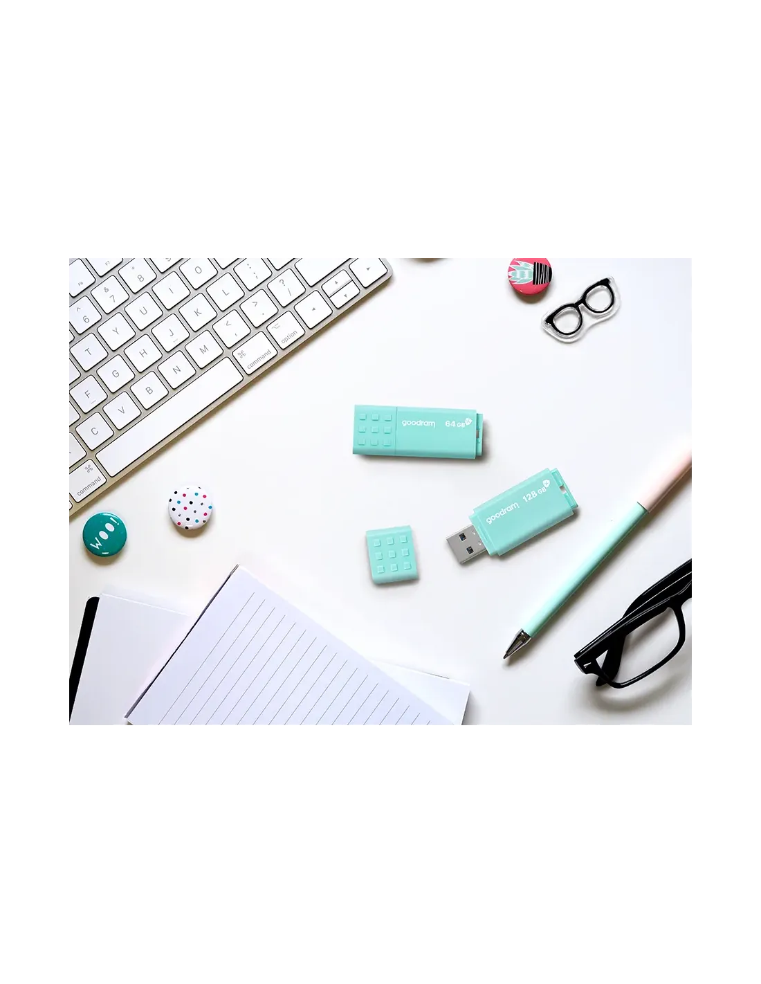Goodram UME3. Capacidad: 64 GB, Interfaz del dispositivo: USB tipo A, Versión USB: 3.2 Gen 1 (3.1 Gen 1), Velocidad de lectura: 60 MB/s, Velocidad de escritura: 20 MB/s. Factor de forma: Tapa. Peso: 9 g. Color del producto: Turquesa