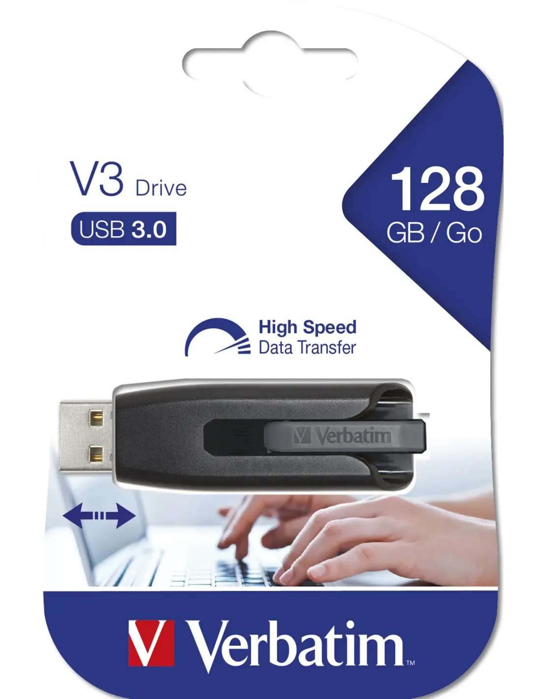 Verbatim V3 - Unidad USB 3.0 128 GB - Negro, 128 GB, USB tipo A, 3.2 Gen 1 (3.1 Gen 1), 80 MB/s, Deslizar, Negro