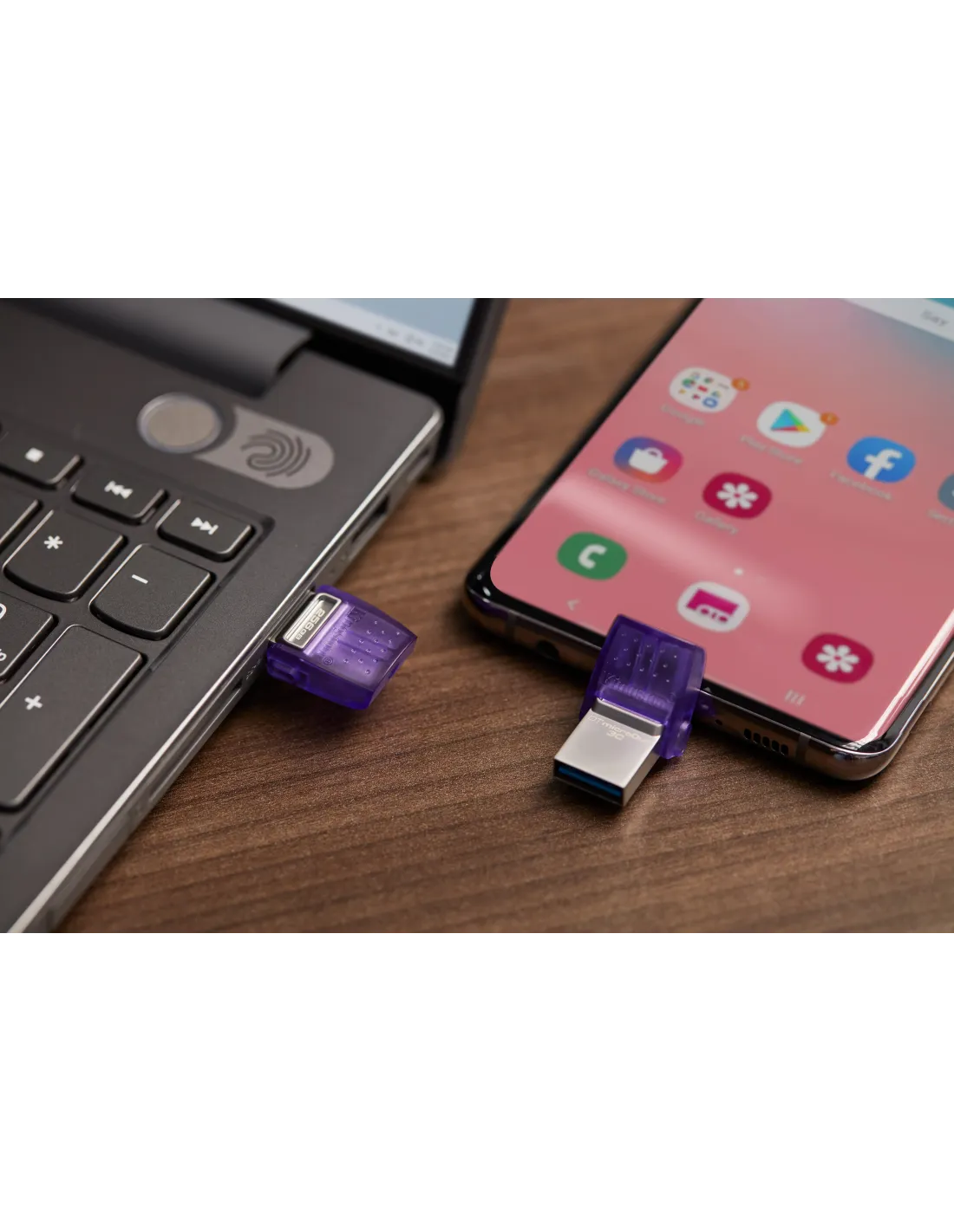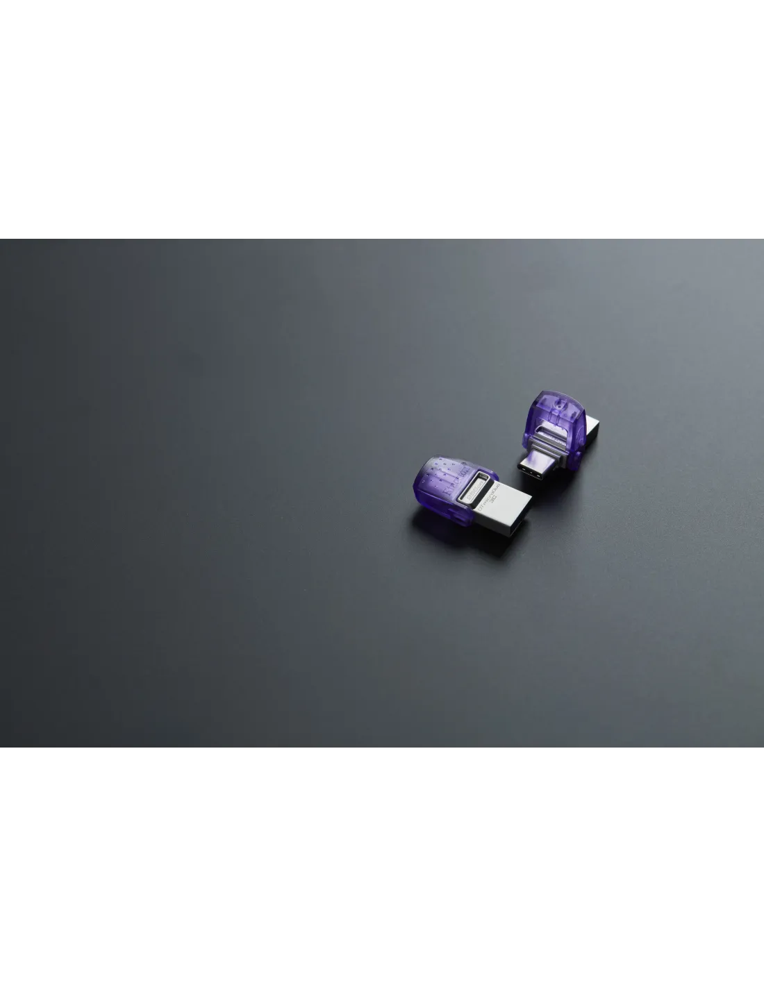 DataTraveler® microDuo™ 3C tiene una doble interfaz que funciona con los nuevos USB Type-C®1 y los puertos USB Type-A tradicionales. Es una forma ideal de liberar espacio en tu smartphone o tableta con hasta 256 GB2 de almacenamiento adicional para fotos y vídeos. El atractivo formato ofrece una cómoda conectividad plug and play. Transfiere rápidamente archivos entre tus dispositivos a una velocidad de hasta 200 MB/s de lectura por el USB 3.2 Gen 1Tanto si trabajas a distancia (OTG4), como si viajas o simplemente deseas capturar el momento, DT microDuo 3C es el compañero compacto ideal para hacer copias de seguridad, almacenar más datos y llevarlo todo allá donde vayas.Transferencias de alta velocidad entre dispositivosRendimiento USB 3.2 Gen 1 para velocidades de hasta 200 MB/s: libera espacio en tu dispositivo móvil y transfiere 1.000 fotos de alta resolución a tu ordenador en menos de un minuto.Más espacio de almacenamientoCapacidad de hasta 256 GB2 para disponer de más espacio de almacenamiento cuando estés de viaje.Conectores dobles para una máxima compatibilidadConectores USB Type C y Type-A para una mayor versatilidad y fiabilidad a la hora de compartir y almacenar archivos.Formato atractivoTapón protector de color con mecanismo giratorio para proteger el conector USB Type-C reversible.