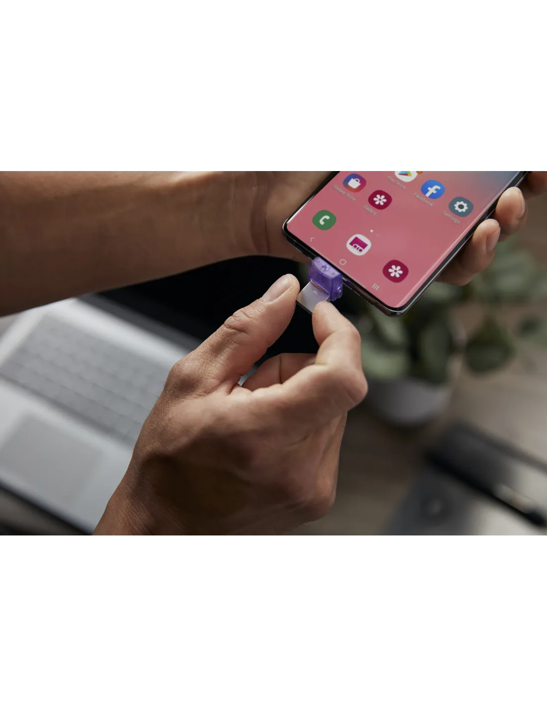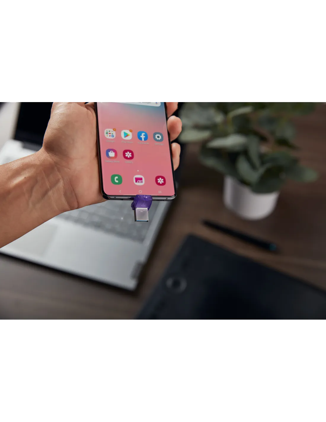 DataTraveler® microDuo™ 3C tiene una doble interfaz que funciona con los nuevos USB Type-C®1 y los puertos USB Type-A tradicionales. Es una forma ideal de liberar espacio en tu smartphone o tableta con hasta 256 GB2 de almacenamiento adicional para fotos y vídeos. El atractivo formato ofrece una cómoda conectividad plug and play. Transfiere rápidamente archivos entre tus dispositivos a una velocidad de hasta 200 MB/s de lectura por el USB 3.2 Gen 1Tanto si trabajas a distancia (OTG4), como si viajas o simplemente deseas capturar el momento, DT microDuo 3C es el compañero compacto ideal para hacer copias de seguridad, almacenar más datos y llevarlo todo allá donde vayas.Transferencias de alta velocidad entre dispositivosRendimiento USB 3.2 Gen 1 para velocidades de hasta 200 MB/s: libera espacio en tu dispositivo móvil y transfiere 1.000 fotos de alta resolución a tu ordenador en menos de un minuto.Más espacio de almacenamientoCapacidad de hasta 256 GB2 para disponer de más espacio de almacenamiento cuando estés de viaje.Conectores dobles para una máxima compatibilidadConectores USB Type C y Type-A para una mayor versatilidad y fiabilidad a la hora de compartir y almacenar archivos.Formato atractivoTapón protector de color con mecanismo giratorio para proteger el conector USB Type-C reversible.