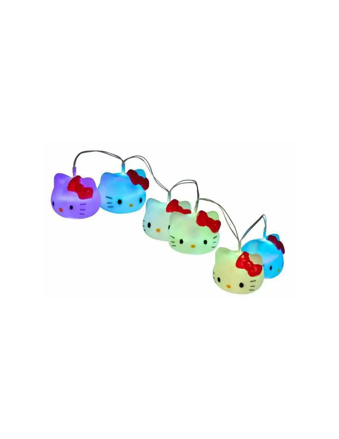 Teknofun presenta esta guirnalda luminosa de "Hello Kitty". Se trata de una guirnalda de luz LED, con 7 colores diferentes, inalámbrica, de 1.20 m de largo, con 2 funciones de luz y 6 cabezas de Hello Kitty diferentes, que incluye botón ON/OFF. Requiere 3 pilas AAA (no incluidas).