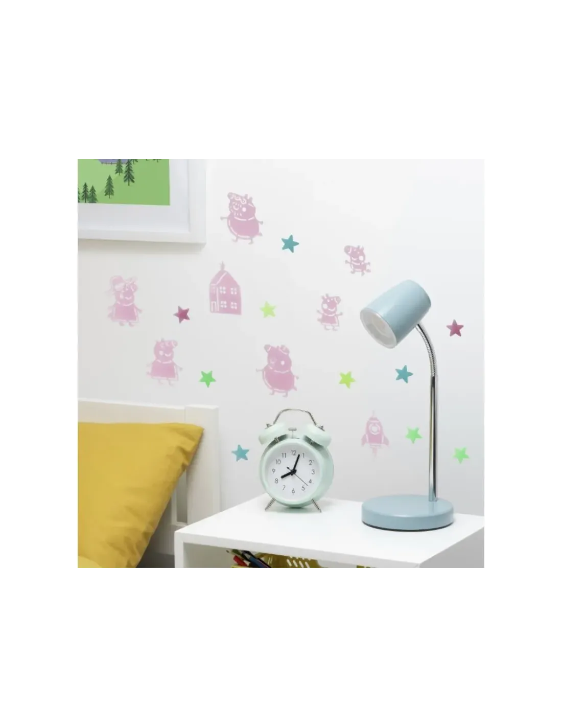 Vinilo decorativo Peppa Pig con estrellas que brillan en la oscuridad. Contiene 200 estrellas que brillan en la oscuridad, con 6 personajes, 1 cohete y 1 casa.