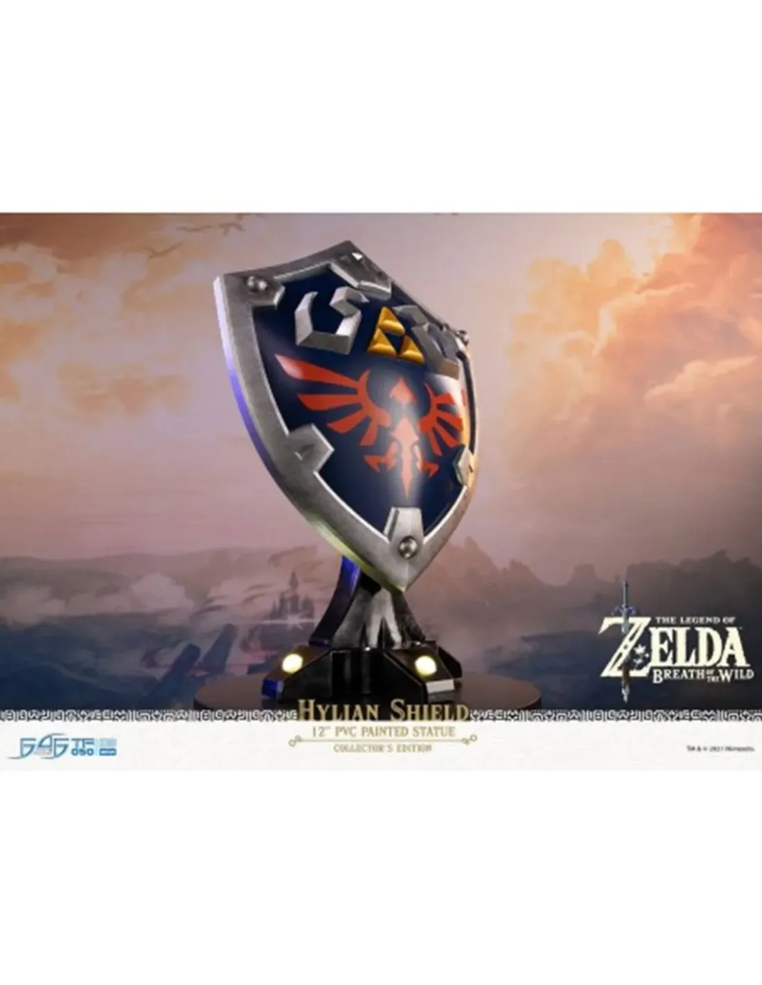 FIRST 4 FIGURES presenta la versión coleccionista del escudo Hylianobasado en "The Legend Of Zelda: Breath of The Wild". El escudo mide unos29 cm y se sostiene con una base magnética. En la versión paracoleccionista la base lleva un sensor para activar las luces led que iluminanel escudo.
