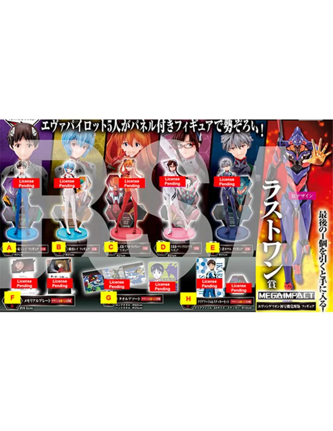 Ichiban Kuji, que significa "lotería número 1", es un sistema de lotería deejecución limitada creado por Bandai. IMPORTANTE: CADA TICKET SERECOMIENDA VENDER A 15 A PVP. EL PREMIO CONSIDERADO COMO "LASTONE" O ULTIMO PREMIO, SE ENTREGA UNICAMENTE TRAS EL ULTIMOTICKET VENDIDO y no esta contabilizada en el lote de articulos sino que esadicional. Este KUJI tiene un total de 80 premios, sin contar el LAST ONE yposee un buen numero de figuras de todo tipo y otros premios increibles.En este tipo de lotería los premios varían, pero el premio mayor que es elUltimo Premio , cuales son las Figuras Ichibansho.Estas figuras son figuras de 6 pulgadas de alto, a veces más grandes, yson geniales para cualquier fanático de la serie.A-Shinji Ikari 21cm 1 pieza/juegoB-Ray Ayanami 21cm 1 pieza/juegoC-Asuka Langley 21cm 2 piezas/juegoD-Mari Makinami 21cm 2 piezas/juegoE- Kaworu Nagisa 21cm 2 piezas/juegoF- Soporte acrílico 9,5 cm 16 piezas/juego (8 estilos)G- Servilleta 60cm o 10cm 28 piezas/juegot (8 estilos)H - Carpeta Juego de pegatinas A4 y 10cm 28 piezas/juego (10 estilos)