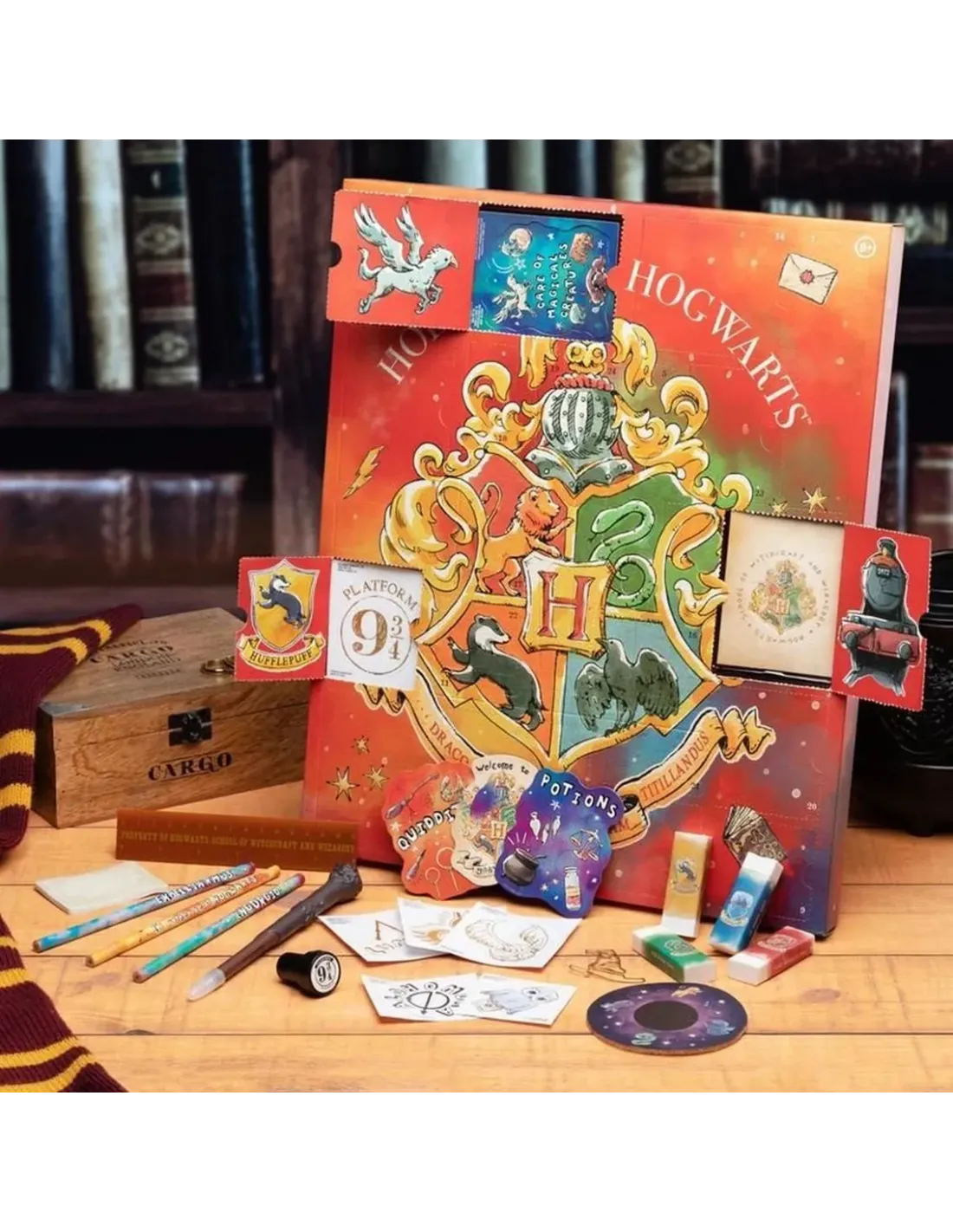 PALADONE - Calendario de adviento 2022 Harry Potter (Hogwarts).Incluye: 1 bolígrafo con forma de varita mágica, 4 gomas de borrar, 3lápices, 1 baraja de cartas, 1 bloc de notas, 1 sello, 1 regla, 4 imanes, 1posavasos, 1 tijera y 6 pegatinas.Tamaño: 35.5 x 43 x 3.5 cmPeso: 611 gramos