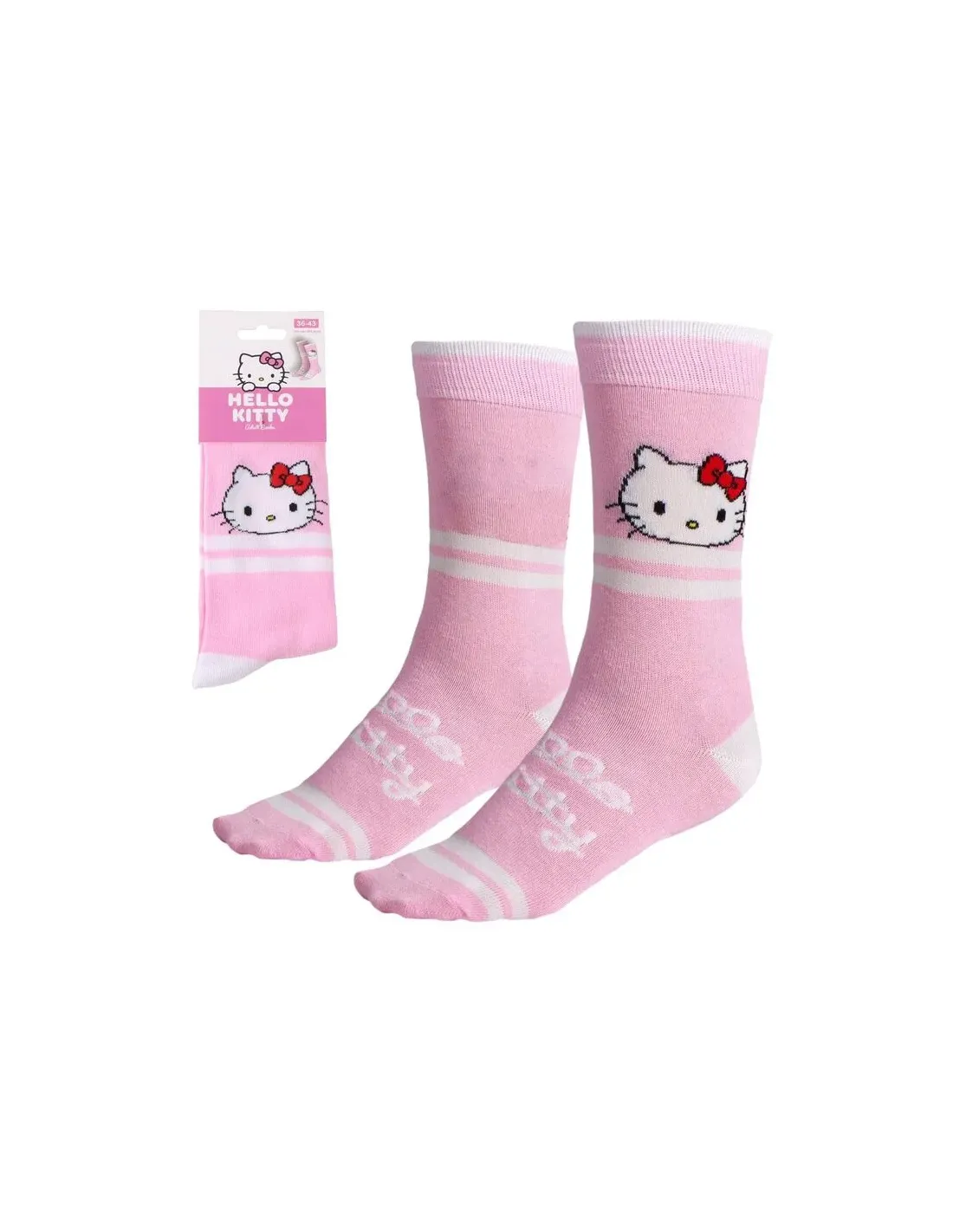Características de los Calcetines Hello Kitty Talla 36-43Diseñados para los fans del icónico personaje japonés, los **calcetines Hello Kitty** combinan comodidad, estilo y un diseño adorable que destaca en cualquier ocasión. Con un estampado clásico de Hello Kitty en tonos rosados, estos calcetines son ideales tanto para uso diario como para regalar. Su diseño de caña media y su talla única (36-43) los hacen versátiles y cómodos para diferentes tipos de pie.Diseño licenciado oficial Hello KittyEstos calcetines cuentan con la licencia oficial de **Sanrio**, garantizando un diseño fiel y de calidad. El rostro de Hello Kitty está bordado en la parte superior, acompañado de detalles en blanco y rosa que refuerzan su estética dulce y reconocible.Licencia oficial Hello KittyColor principal: rosa con detalles blancosEstampado de rostro bordadoComodidad y ajuste para uso diarioGracias a su tejido elástico, se adaptan bien al pie sin presionar, ofreciendo una sensación agradable durante todo el día. Su talla única abarca desde el número 36 al 43, lo que los hace adecuados para adolescentes y adultos.Talla única: 36-43Tejido cómodo con ajuste elásticoDiseño de caña mediaPerfectos para regalar o coleccionarEstos calcetines no solo son prácticos, sino también un detalle perfecto para los fans de Hello Kitty. Su presentación en blíster con ilustración oficial los convierte en una opción ideal para regalo.Incluye packaging ilustradoIdeal como regalo temáticoComplemento de moda friki y juvenilOtras especificacionesContenido del paquete: 1 parTipo: calcetines de caña mediaDiseño unisex
