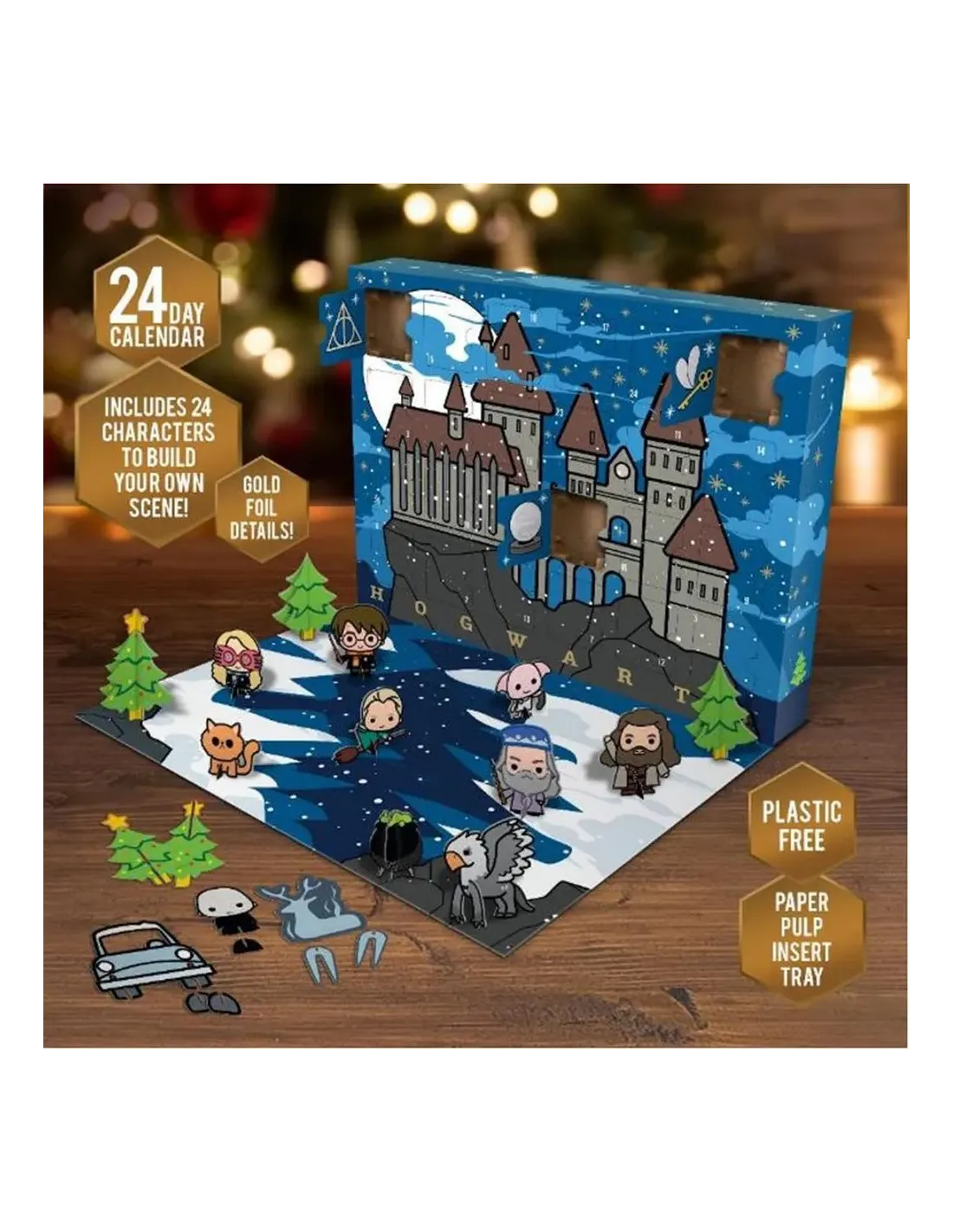 Calendario de Adviento puzzle 3D de Harry Potter. Calendario de Adviento libre de plástico, que contiene 24 personajes y rompecabezas para crear tu propia escena de Harry Potter en 3D.