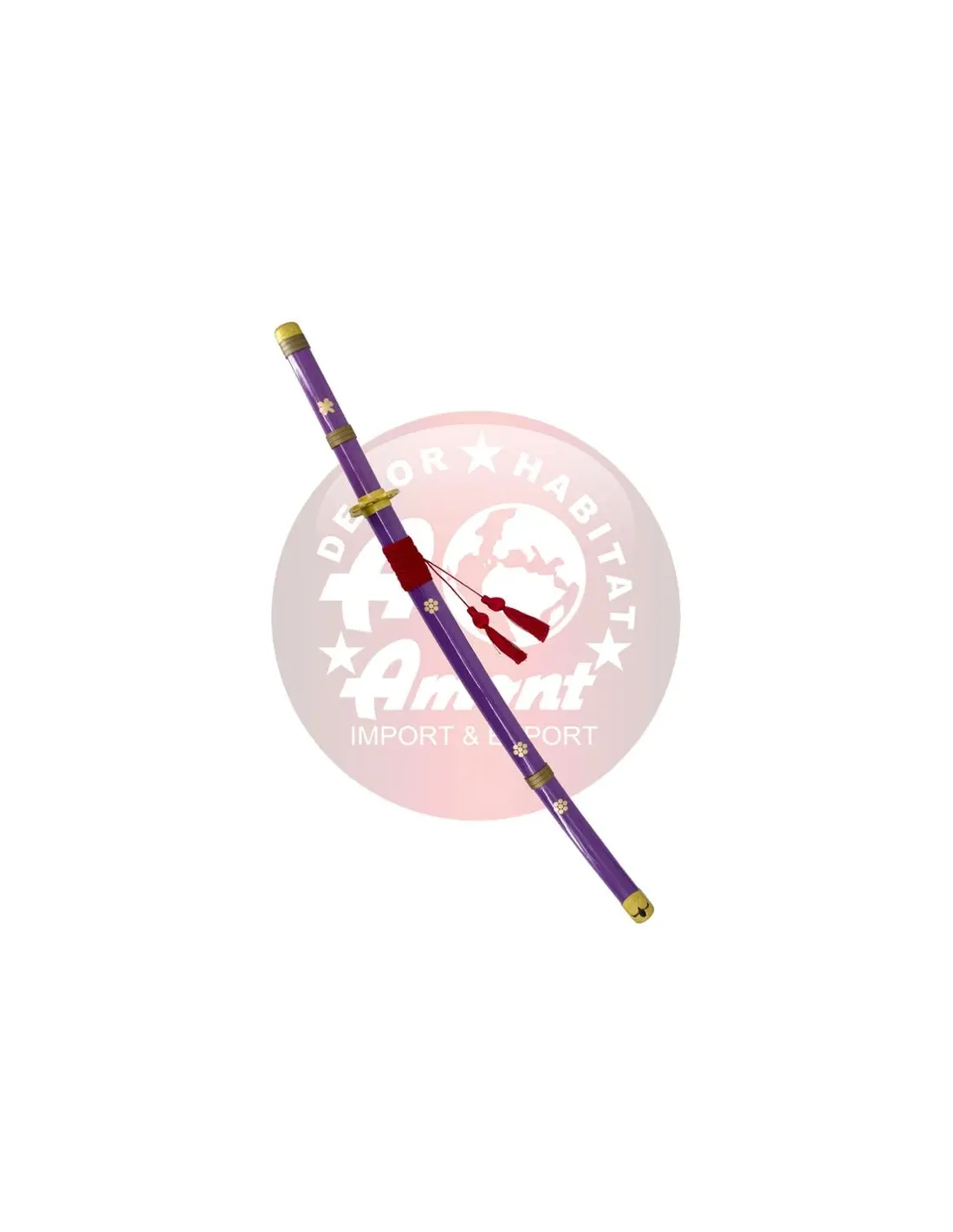 Características de la Katana Enma Lila de Zoro One Piece 103 cm Manga EditionInspirada directamente en el icónico anime **One Piece**, esta katana decorativa es una fiel réplica de **Enma**, la espada empuñada por Zoro durante el arco de Wano. Diseñada para coleccionistas y fans del universo de Eiichiro Oda, ofrece un nivel de detalle visual impresionante, perfecta para exposición o como pieza central de cualquier colección otaku.Diseño fiel al anime y acabados decorativos de alta calidadCon una longitud total de 103 cm, esta katana presenta una hoja de acero sin filo en acabado negro, decorada con detalles en amarillo y verde que reproducen fielmente el estilo del manga. Su vaina lila con detalles dorados y cordaje rojo refuerzan su presencia visual, mientras que el mango lila decorado en dorado completa un conjunto estético espectacular.Hoja de acero sin filo con acabado negroDecoración cromática: amarillo y verde en la hojaVaina lila con detalles doradosMango lila con acabado doradoEncordado rojo decorativoIdeal para coleccionistas y fans de One PieceEsta katana no está pensada para el combate ni corte real, sino como pieza de decoración o colección. Es perfecta para exhibir junto a otras espadas de Zoro o en estanterías temáticas. Su nivel de detalle hace que sea un regalo perfecto para cualquier fan de One Piece que desee tener un pedazo del mundo de Wano en casa.Réplica decorativa de la espada Enma de ZoroLongitud total: 103 cmApta solo para exhibiciónOtras especificacionesTipo de producto: Katana decorativaUniverso: One Piece (Manga Edition)Uso recomendado: coleccionismo y decoración