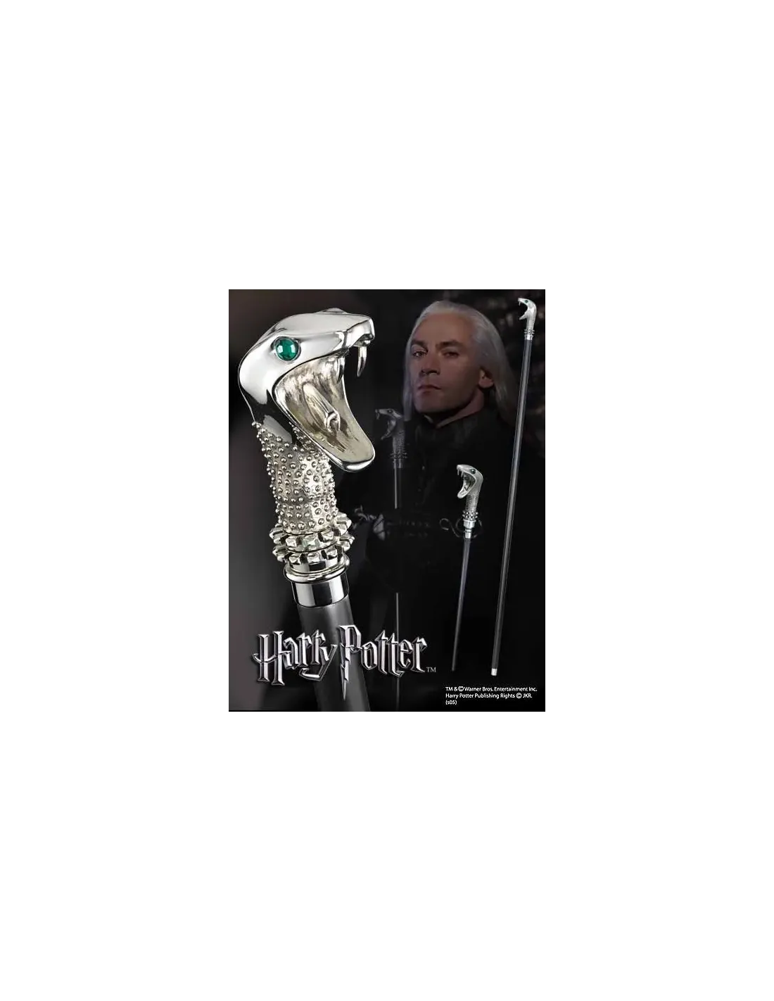 Lucius Malfoy es el padre de Drago y el esposo de Narcisa. Trabaja en el Ministerio de la Magia y es uno de los mortífagos más ambiciosos.Su bastón con cabeza de serpiente contiene su varita mágica. El bastón mide 115 cm. y la varita mágica 25 cm. La cabeza de la serpiente esta chapada en plata e incrustada de cristales strass.Material: Madera y metal chapado en plataDimensiones: 115cm // 25cmRéplica exacta y a escala real del bastón de Lucius Malfoy, ocultando en su interior la varita. Medida aproximada 116 cm, basado en las pelculas de "Harry Potter".