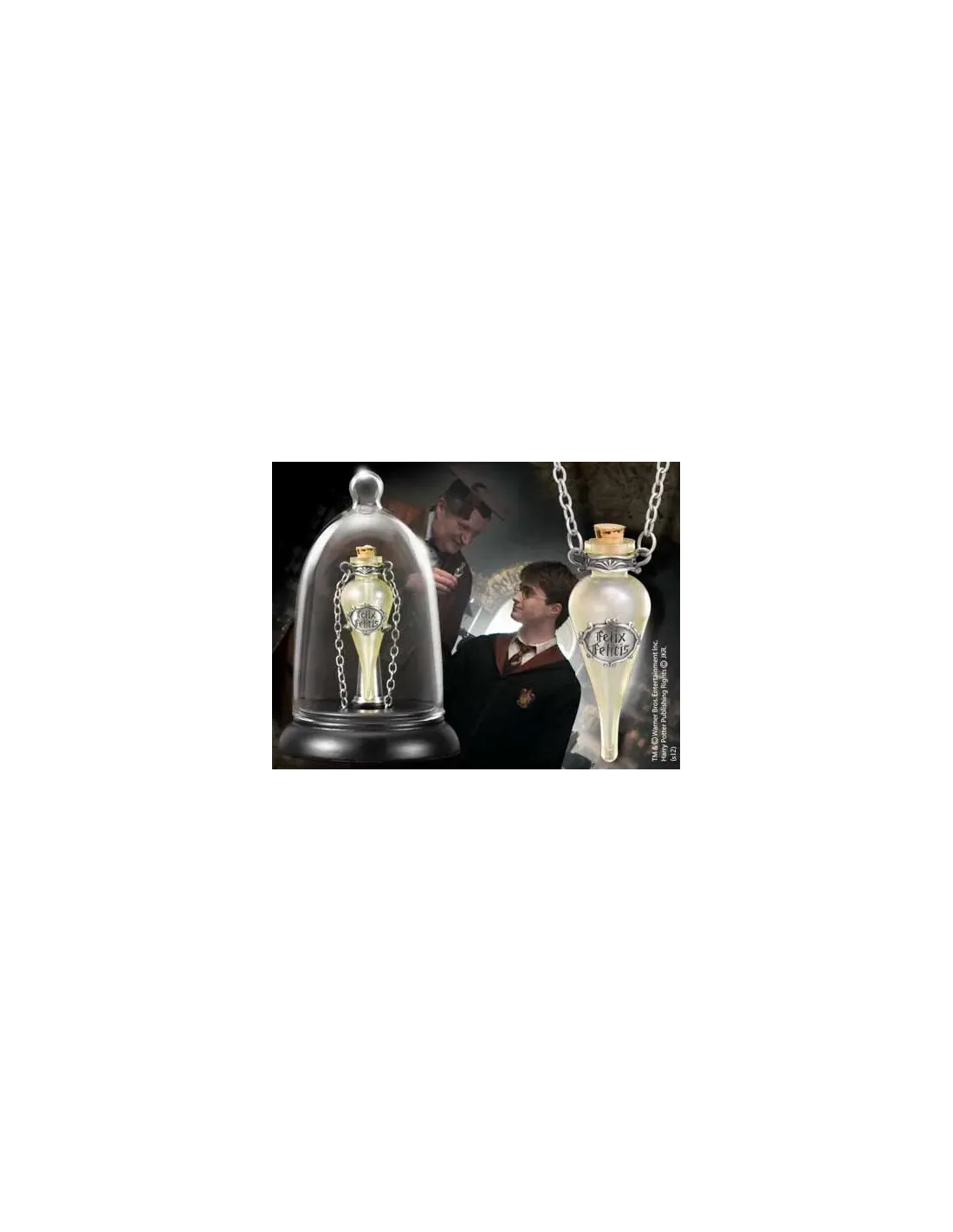 Collar con colgante de botella de cristal y adorno met·licos con la pociÛnFelixFelicis conocida como Suerte LÌquida y cadena de 45 cm. Se presenta enexpositor transparente. Basada en las pelÌculas de Harry Potter.