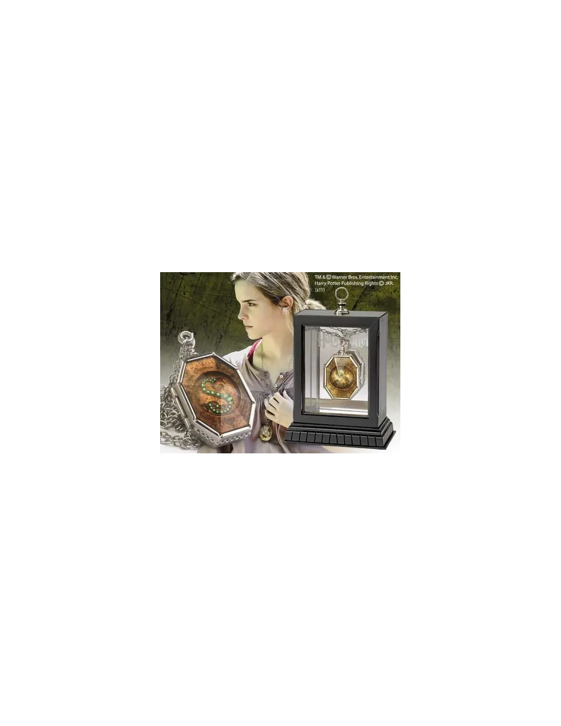 Réplica del horrocrux guardapelo de Salazar Slytherin con cadena,presentado en una caja joyero para exponerlo y guardarlo. Pieza basada enlas películas de "Harry Potter".