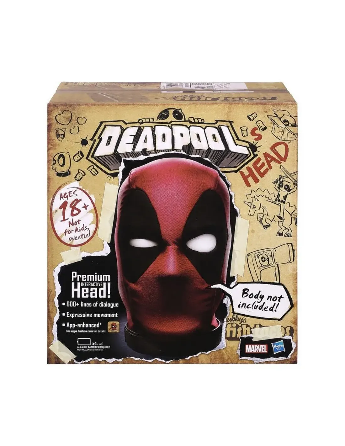 Esta cabeza de Deadpool es una fiel replica del antiheroe de marvelmás querido. Tiene más de 600 efectos y frases (en inglesoriginal) que haran que nunca caiga en la monotonia.Posee además una app movil con la que puedes pedirle a Deadpoolque te cuente una broma o chiste, o incluso pedirle que por favor tedespierte de manera romántica por la mañana o todo lo contrario.Reacciona a la luz, por lo que puedes meterlo en una zona oscuracomo un frigorífico o un cajón, y cuando lo abran asustar a tu familiao amigos.Además no solo reacciona a la luz, también reacciona a toques,golpes e incluso cuando es levantado o girado. Y por supuesto...Deadpool te esta escuchando a cada palabra que digas, muchocuidado.