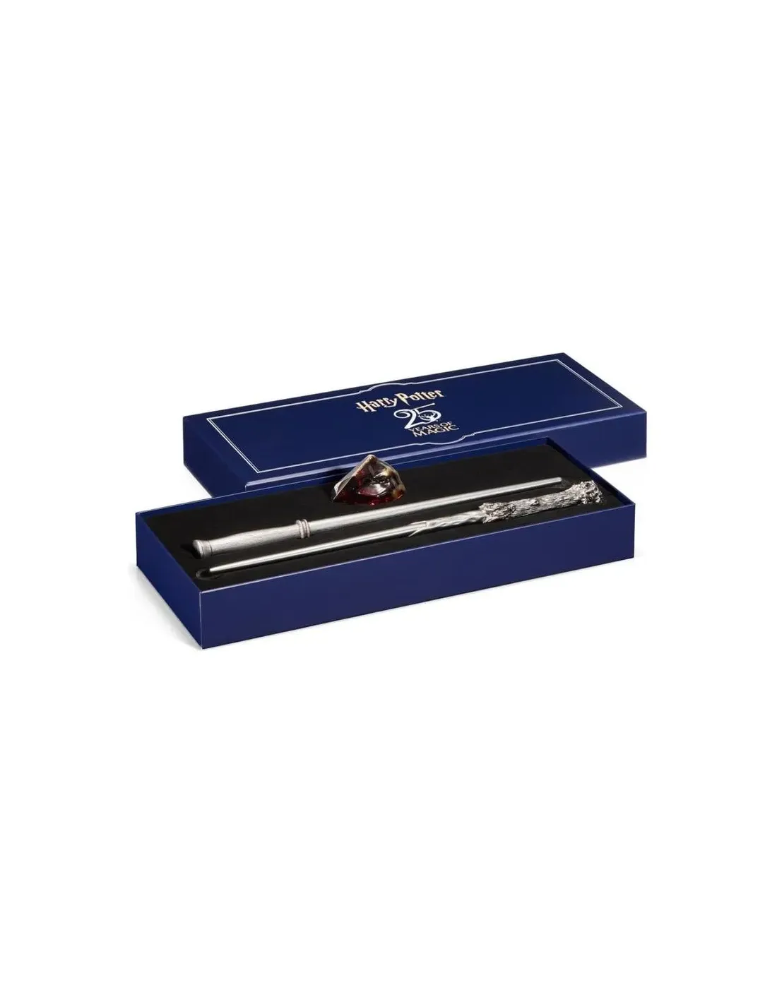 Características del Set de Aniversario Harry Potter Piedra Filosofal y VaritasEl Set de Aniversario Harry Potter y la Piedra Filosofal conmemora el 25º aniversario de la primera película de la saga con una presentación pensada para coleccionistas y fans del universo mágico creado por J.K. Rowling. Este set premium incluye dos varitas de colección y una réplica de la Piedra Filosofal, cuidadosamente presentadas en una caja especial que realza su valor como pieza de exposición.Set conmemorativo del 25º aniversarioEste conjunto ha sido diseñado para celebrar uno de los momentos más icónicos del mundo de Harry Potter. Incluye dos varitas detalladas y una reproducción de la legendaria Piedra Filosofal, uno de los objetos mágicos más importantes de la primera película. Su presentación en caja de colección lo convierte en un artículo ideal para exhibir.Edición conmemorativa del 25º aniversario de Harry Potter y la Piedra FilosofalIncluye dos varitas de colecciónRéplica de la Piedra Filosofal incluidaMateriales de calidad y acabados detalladosLas varitas están fabricadas en resina, un material resistente que permite reproducir con gran detalle su diseño. La Piedra Filosofal está elaborada en lucita, una resina translúcida que aporta un acabado visual muy similar al del objeto mostrado en la película.Varitas fabricadas en resinaPiedra Filosofal en lucita (resina translúcida)Acabados pensados para colección y exposiciónPresentación en caja de colecciónEl set se presenta en una caja de colección especialmente diseñada que protege las piezas y permite exhibirlas con elegancia. Su formato y dimensiones están pensados para destacar cada elemento del conjunto, convirtiéndolo en un regalo ideal para fans y coleccionistas de Harry Potter.Caja de colección: 38,1 x 16,5 cmDiseño pensado para exposiciónPresentación cuidada para coleccionistasDimensiones de los elementosLas piezas incluidas mantienen unas dimensiones que reproducen de forma fiel los objetos del universo cinematográfico, permitiendo disfrutarlas como elementos decorativos o de colección.Varita 1: 33 cmVarita 2: 34,3 cmPiedra Filosofal: 7,6 cm