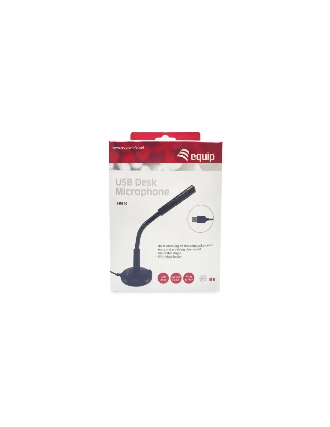 Micrófono de alto rendimiento con interruptor de silenciosoporte estableAngulo ajustableInstalación simple plug-and-playConector USB-AEl micrófono de escritorio Equip® 245340 USB es un micrófono de alto rendimiento con interruptor de silencio de encendido / apagado y trípode, para una reproducción de voz extraordinariamente clara y natural.Adecuado para discordia, cine en casa, chat, podcast, Skype, grabación, voz, mensajería instantánea, juegos, canto, conferencias, etc. y es un dispositivo plug and play. No se necesita drivers ni fuente dealimentación adicional.Micrófono de alto rendimiento con interruptor de silenciosoporte estableÁngulo ajustableInstalación simple plug-and-playFrequencia respuesta 100Hz-16KHzImpedancia (ohm) 2200OSensibilidad -47dB±4dBMedida cable 1.2m