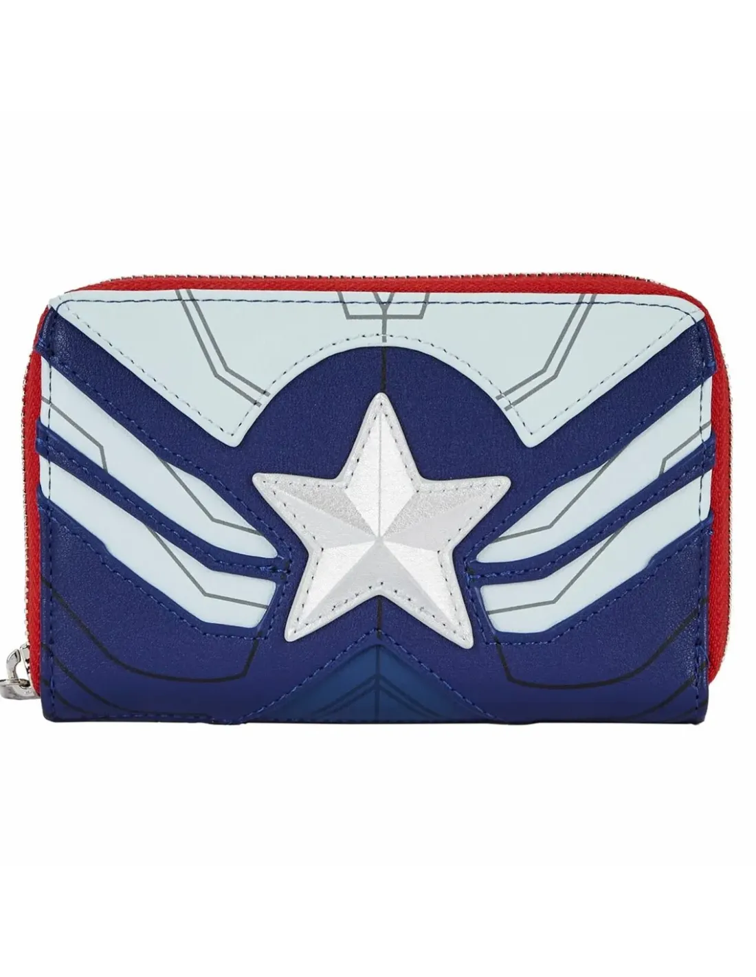 Loungefly Marvel Falcon Capitán América Cosplay Cartera con cremalleraAncho: 6" X Alto: 4"Cartera de piel sintética con cremallera.Detalles bordados, apliques y grabados.