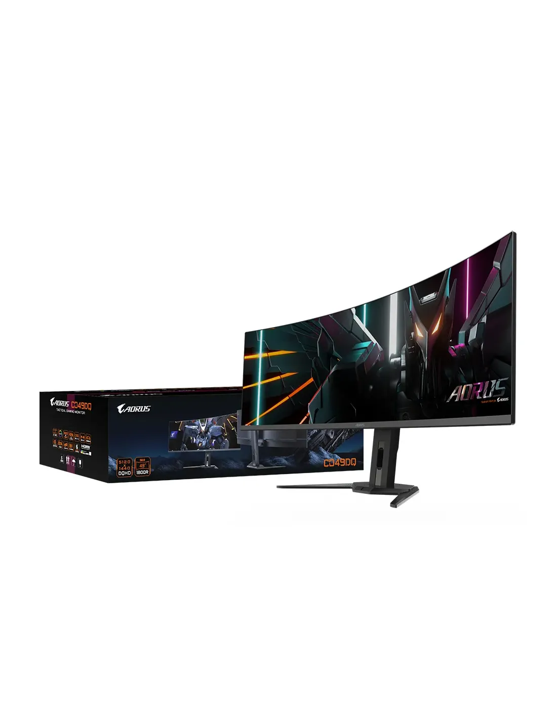 GIGABYTE Monitor de juegos curvo CO49DQ OLED - 5120x1440 (DQHD), 1800R, 144Hz, 0.03ms, KVM, FreeSync Premium Pro, HDMI 2.1. Diagonal de la pantalla: 124,5 cm (49"), Resolución de la pantalla: 5120 x 1440 Pixeles, Tipo HD: DQHD, Tecnología de visualización: OLED, Tiempo de respuesta: 0,03 ms, Relación de aspecto nativa: 32:9, Ángulo de visión, horizontal: 178°, Ángulo de visión, vertical: 178°. Altavoces incorporados. Conector USB incorporado. montaje VESA, Ajustes de altura. Color del producto: Negro