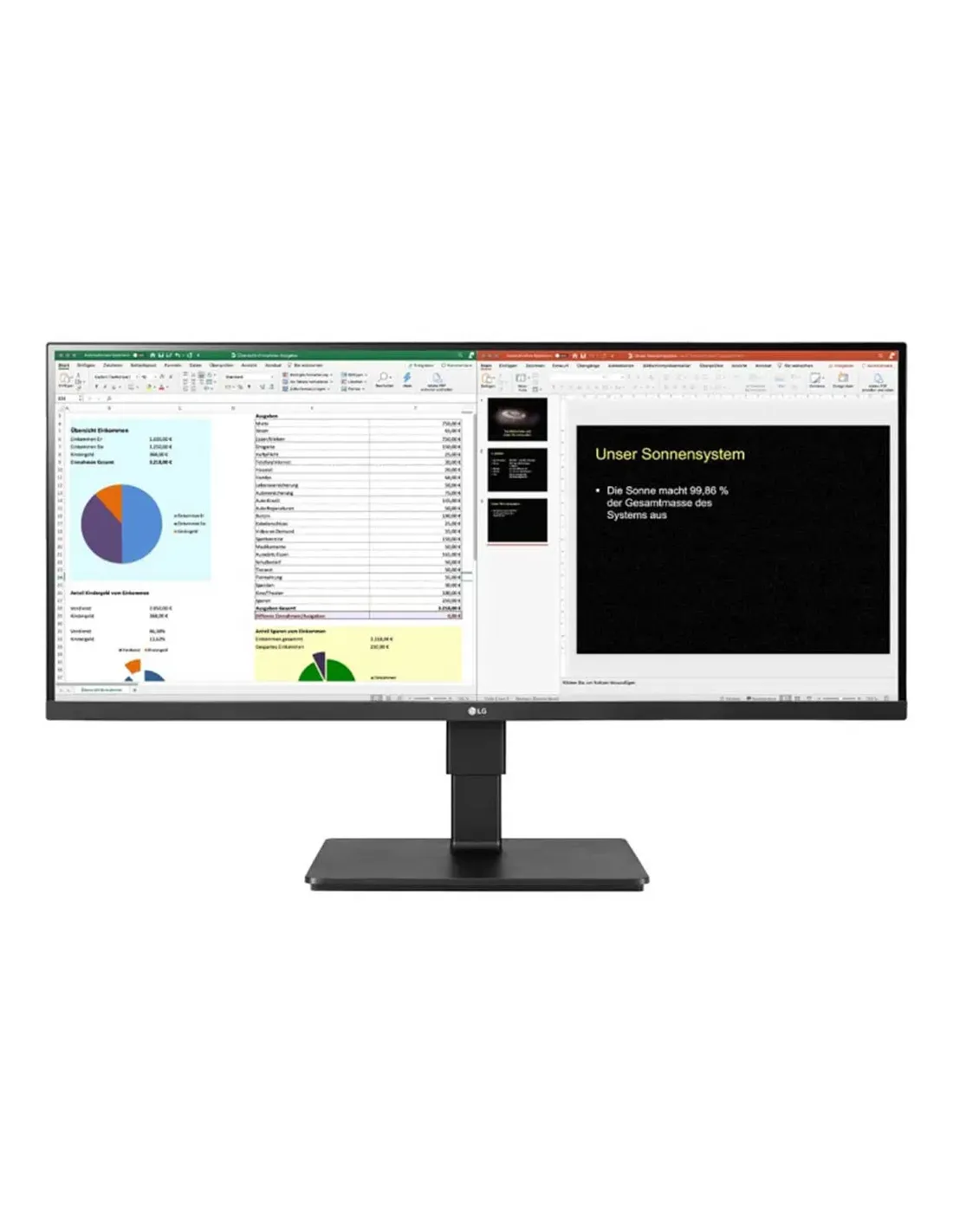 LG 34BR65F-B. Diagonal de la pantalla: 86,4 cm (34"), Resolución de la pantalla: 2560 x 1080 Pixeles, Tipo HD: WFHD, Tecnología de visualización: LCD, Tiempo de respuesta: 5 ms, Relación de aspecto nativa: 21:9, Ángulo de visión, horizontal: 178°, Ángulo de visión, vertical: 178°. Altavoces incorporados. montaje VESA, Ajustes de altura. Color del producto: Negro