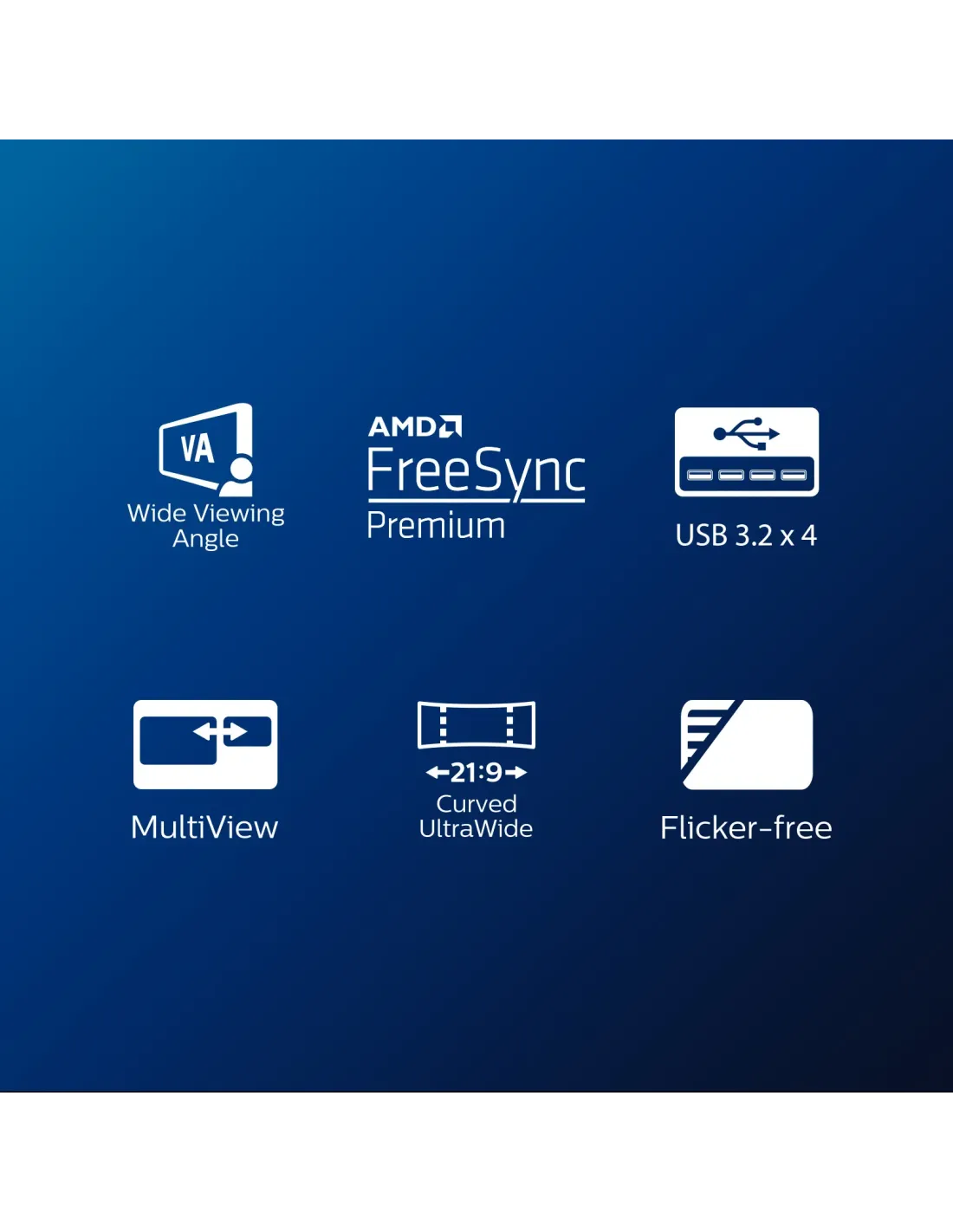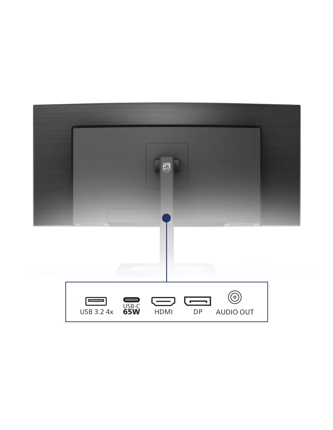 La pantalla UltraWide curvada Philips E line ofrece una amplia visualización panorámica. La pantalla WQHD con soporte ergonómico proporciona unas condiciones de visualización óptimas. Las conexiones USB-C todo en uno y MultiView cumplen con todos los requisitos de productividad.