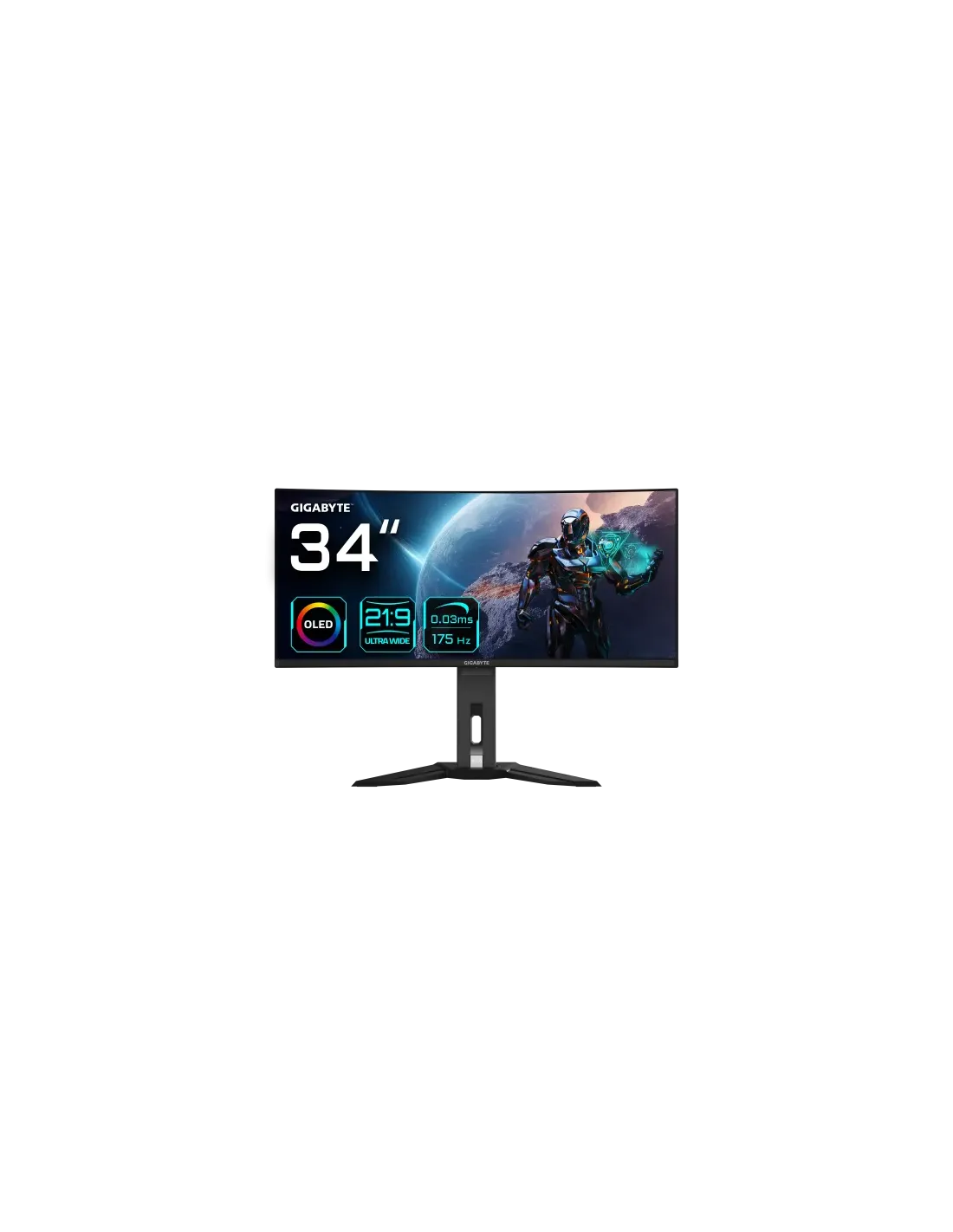 Gigabyte MO34WQC. Diagonal de la pantalla: 86,4 cm (34"), Resolución de la pantalla: 3440 x 1440 Pixeles, Tipo HD: Wide Quad HD, Tecnología de visualización: OLED, Tiempo de respuesta: 0,03 ms, Relación de aspecto nativa: 21:9, Ángulo de visión, horizontal: 178°, Ángulo de visión, vertical: 178°. Altavoces incorporados. Conector USB incorporado. montaje VESA, Ajustes de altura. Color del producto: Negro