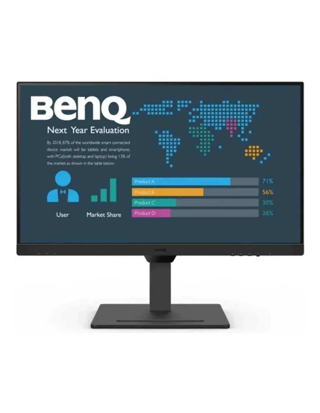 Sobre el productoEl monitor BL2790QT mejora la productividad general, ya que un cable USB-C* y un concentrador USB integrado conectan todo. Con detalles y calidad impecables, el BL2790QT tiene un diseño personalizable que presumede un nivel elevado de elegancia en el trabajo.CaracterísticasLa conectividad versátil dirige su flujo de trabajo: Los puertos perfectos reducen el desorden de cables. Un solo cable USB-C de forma simultánea proporciona una rápida transferencia de datos y una entrega dealimentación de 65W para su portátil. Los puertos cuidadosamente colocados transmiten los datos y la alimentación a su teléfono y aumentan la comodidad de varios dispositivos.Cadena margarita: Conecte su ordenador para crear una configuración de varios monitores para espacio de pantalla adicional, y un espacio de trabajo ordenado mediante la conexión en cadena. Utilice el eje giratoriopara personalizar las vistas en varias pantallas.Ergonómico: El diseño ergonómico permite personalizar fácilmente la altura, la inclinación, el eje giratorio y la base giratoria del monitor, lo que aumenta la eficiencia en un entorno de usuario cómodo. Vea la imagencompleta y disfrute de las imágenes en su contexto completo.Detalles con una calidad de imagen brillante: Con resolución 2K QHD, BL2790QT muestra más espacio para el contenido en pantalla, al tiempo que ofrece detalles impresionantes incluso en fuentes más pequeñas.Cambiar sin problemas con un solo clic: Botones cómodamente colocados para cambiar entre micrófono, altavoz y necesidades de cuidado ocular. Utilice el controlador de 5 vías como navegador de un solo paro paraalcanzar todos los ajustes.Optimización inteligente para un brillo de contenido perfecto: La exclusiva tecnología eye care de BenQ reduce la fatiga ocular para asegurar la comodidad, aumentar la productividad y garantizar la seguridad del lugar detrabajo del usuario durante usos prolongados. El sensor Brightness Intelligence detecta cambios de luz en su entorno de visualización y ajusta activamente el brillo de la pantalla para poder disfrutar de experiencias devisualización cómodas. B.I. Gen2 permite un mayor grado de ajuste mediante el brillo de pantalla.Tecnología Low Blue Light Plus: La tecnología filtra la radiación azul violeta más corta y de más energía, que daña los ojos, mientras conserva la calidad de colores vívidos.Tecnología sin parpadeo: La exclusiva tecnología sin parpadeo de BenQ elimina el parpadeo en todos los niveles de brillo para reducir la fatiga ocular, la fatiga y los dolores de cabeza.Modo de debilidad de color: Los filtros rojo y verde en el monitor ayudan a las personas con deficiencia de percepción del color a distinguir los colores más fácilmente.Modo ePaper: El efecto de libro electrónico simulado con un claro diseño de lectura en blanco y negro permite una mejor experiencia de lectura.Garantía de certificación ecológica: El BL2790QT de BenQ cuenta con la certificación Energy Star, EPEAT y TCO para facilitar a empresas, instituciones y gobiernos la toma de decisiones de compra ecológicas.Modos personalizados para uso múltipleModo de M-Book: Para minimizar las diferencias visuales entre el monitor y el producto de la serie MacBook conectado.Modo de codificación: Diseñado para que cada color destaque y para mayor legibilidad con contraste optimizado y saturación del modo oscuro.Especificaciones BenQ BL2790QTExhibiciónDiagonal de la pantalla: 68,6 cm (27")Resolución de la pantalla: 2560 x 1440 PixelesTipo HD: Quad HDRelación de aspecto nativa: 16:9Tecnología de visualización: LEDTipo de pantalla: IPSTipo de retroiluminación: LEDBrillo de la pantalla (típico): 350 cd / mTiempo de respuesta: 5 msPantalla antirreflectante: SiForma de la pantalla: PlanaRelación de aspecto: 16:9Razón de contraste (típica): 1000:1Máxima velocidad de actualización: 75 HzÁngulo de visión, horizontal: 178Ángulo de visión, vertical: 178Número de colores de la pantalla: 16,7 millones de coloresDensidad del pixel: 109 pppDiagonal de pantalla: 69 cmEspacio de color RGB: sRGBCobertura sRGB (típica): 99%DesempeñoTecnología Flicker free (reduce el parpadeo de la pantalla): SiTecnología Low Blue Light (baja luz azul): SiModo de juego: SiModos inteligentes: personalizado, Juego, M-Book, Película, Estándar, ePaperMultimediaAltavoces incorporados: SiCámara incorporada: NoNúmero de altavoces: 2Potencia estimada RMS: 4 WDiseñoPosicionamiento de mercado: HogarColor del producto: NegroColor de pies: NegroPuertos e InterfacesConector USB incorporado: SiCantidad de puertos USB descendentes de tipo A: 3Cantidad de puertos downstream USB tipo C: 1USB Type-C DisplayPort Alternate Mode: SiSuministro de potencia USB: SiEntrega de energía USB (USB Power Delivery) de hasta: 65 WHDMI: SiNúmero de puertos HDMI: 1Versión HDMI: 1.4Cantidad de DisplayPorts: 2Versión de DisplayPort: 1.2Cantidad de puertos Thunderbolt 3: 1Salida de auriculares: SiHDCP: SiHDCP versión: 1.4Ergonomíamontaje VESA: SiInterfaz de panel de montaje: 100 x 100 mmAjustes de altura: SiAjuste de altura: 11 cmEje: SiÁngulo de pivote: -90 - 90Giratorio: SiÁngulo de giro (alcance): -20 - 20Ángulo de inclinación: -5 - 20Exhibición en pantalla (OSD): SiIdiomas OSD: Árabe, Chino simplificado, Checo, Holandés, Inglés, Francés, Húngaro, Italiano, Japonés, Coreano, Noruego, Polaco, Portugués, Rumano, Ruso, SuecoNúmero de lenguajes OSD: 18Ajuste de la inclinación: SiControl de energíaClase de eficiencia energética (SDR): FConsumo de energía (SDR) por 1000 horas: 25 kWhConsumo energético: 20 WConsumo de energía (inactivo): 0,3 WConsumo de energía (max): 150 WConsumo de energía (apagado): 0,2 WVoltaje de entrada AC: 100 - 240 VTipo de fuente de alimentación: InternoEscala de eficiencia energética: De la A a la GContenido del embalajeStand incluido: SiPeso y dimensionesAncho del dispositivo (con soporte): 372,3 mmProfundidad dispositivo (con soporte): 238