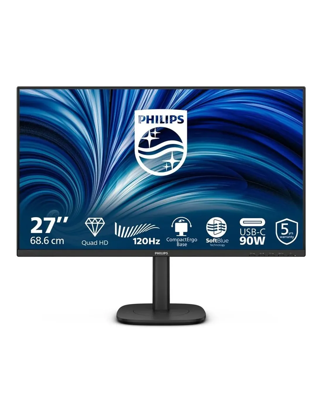 Características del Philips 27B2U3601 - 3000 Series - Monitor LED QHD de 27"El Philips 27B2U3601 es un monitor de 27 pulgadas diseñado para entornos profesionales y usuarios exigentes que buscan calidad de imagen QHD, conectividad avanzada y ergonomía completa. Gracias a su panel IPS, su base ajustable y su conectividad USB-C con alimentación, es una solución ideal para oficinas modernas, teletrabajo y setups productivos.Resolución QHD y panel IPS para máxima calidad visualDisfruta de una imagen nítida y precisa gracias a su resolución QHD de 2560 x 1440 píxeles. El panel IPS garantiza colores consistentes y amplios ángulos de visión, ideal para tareas de diseño, ofimática avanzada o consumo multimedia.Resolución QHD 2560 x 1440 a 120 HzPanel IPS con ángulo de visión de 178°114% NTSC y 125% sRGB para mayor fidelidad de colorFluidez y confort visual en el día a díaEste monitor está optimizado para largas jornadas gracias a tecnologías que mejoran la experiencia visual. La frecuencia de hasta 120 Hz aporta mayor suavidad, mientras que las funciones de protección ocular reducen la fatiga.Frecuencia de actualización de 48 - 120 Hz con Adaptive-SyncTecnologías Flicker Free, SoftBlue y EyesafeTiempo de respuesta de 4 ms (gris a gris)Conectividad avanzada con USB-C y red integradaEl Philips 27B2U3601 destaca por su conectividad versátil y moderna, incluyendo USB-C con carga, ideal para conectar portátiles con un solo cable. Además, incorpora red Gigabit Ethernet para una conexión estable.USB-C con DisplayPort y alimentación de hasta 90 WHub USB 3.2 y múltiples puertos (HDMI, DisplayPort, LAN)Salida DisplayPort y conexión de audioDiseño ergonómico y profesionalSu base Smart Ergo permite ajustar el monitor a cualquier posición para mejorar la postura y la comodidad. Es perfecto para entornos de trabajo intensivo.Ajuste de altura hasta 150 mmRotación, giro de 360° e inclinación -5/+30Compatibilidad VESA 100 x 100 mmEficiencia y sostenibilidadDiseñado con el medio ambiente en mente, este monitor incorpora materiales reciclados y cumple con certificaciones energéticas y medioambientales.Certificaciones ENERGY STAR y TCO85% de plástico reciclado postconsumoEmbalaje 100% reciclableOtras especificacionesBrillo de 350 cd/m² y contraste 1500:1 (dinámico 50000000:1)Altavoces estéreo integrados de 2 WRecubrimiento antirreflejo con 25% de brumaConsumo típico de 23.43 WPeso con soporte: 6.44 kgIncluye cables HDMI, DisplayPort y USB-C