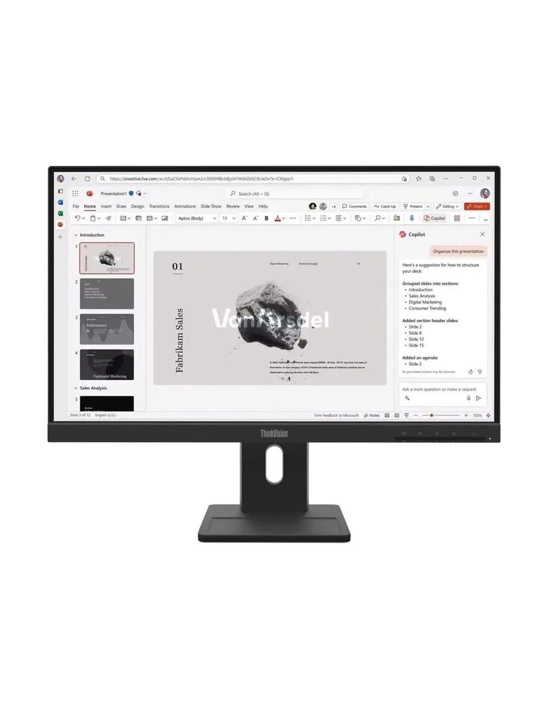 Características del Lenovo ThinkVision E22-40 21.5" Full HD IPSEl Lenovo ThinkVision E22-40 es un monitor de 21,5 pulgadas diseñado para entornos de oficina, teletrabajo y uso diario, que combina una excelente calidad de imagen con ergonomía avanzada. Gracias a su panel IPS Full HD, ofrece colores precisos y amplios ángulos de visión, mientras que su diseño ajustable y conectividad versátil lo convierten en una opción práctica y eficiente para el día a día.Calidad de imagen Full HD con panel IPSDisfruta de una visualización clara y detallada gracias a su resolución Full HD (1920 x 1080). El panel IPS garantiza colores consistentes y una excelente visibilidad desde cualquier ángulo, ideal para trabajar durante largas jornadas o compartir pantalla con otros usuarios.Pantalla de 21,5" con resolución 1920 x 1080 píxelesPanel IPS con ángulos de visión de 178°Brillo de 250 cd/m² y contraste 1300:1Fluidez y confort visual optimizadoEste monitor ofrece una experiencia visual fluida gracias a su frecuencia de hasta 100 Hz y un tiempo de respuesta rápido, reduciendo el desenfoque en movimientos. Además, integra tecnologías de protección ocular que ayudan a reducir la fatiga visual durante el uso prolongado.Frecuencia de actualización de hasta 100 HzTiempo de respuesta de 4 ms (rápido) / 6 ms (GTG)Tecnologías Flicker Free y Low Blue LightDiseño ergonómico y ajuste totalEl ThinkVision E22-40 está diseñado para adaptarse a cualquier espacio de trabajo, con un soporte totalmente ajustable que permite regular altura, inclinación, giro y pivote. Esto facilita una postura más cómoda y saludable durante toda la jornada.Ajuste de altura hasta 15,5 cmFunción pivot (-90° a 90°) y giro completoCompatible con montaje VESA 100 x 100 mmConectividad versátil para cualquier equipoDispone de múltiples opciones de conexión que garantizan compatibilidad con diferentes dispositivos, desde ordenadores de sobremesa hasta portátiles más antiguos o actuales.1x HDMI 1.41x DisplayPort 1.21x VGA (D-Sub)Altavoces integrados y diseño funcionalIntegra altavoces estéreo de 4 W para un uso multimedia básico sin necesidad de periféricos adicionales. Su diseño en color negro con marcos finos favorece una configuración limpia y profesional, ideal para entornos de trabajo modernos.Altavoces integrados 2W x2 (4 W totales)Diseño con biseles finosGestión de cables integradaEficiencia energética y certificacionesEl monitor está optimizado para un consumo reducido y cuenta con certificaciones que garantizan su eficiencia y sostenibilidad, siendo una opción responsable para empresas y usuarios particulares.Clase energética CConsumo típico de 10,5 WCertificaciones ENERGY STAR, EPEAT Gold y TCOOtras especificacionesRelación de aspecto 16:999% cobertura sRGB16,7 millones de colores y profundidad de color de 8 bitsPantalla antirreflectanteSin cámara ni micrófono integradosCompatible con Windows 10 y Windows 11Peso con soporte: 4,1 kg