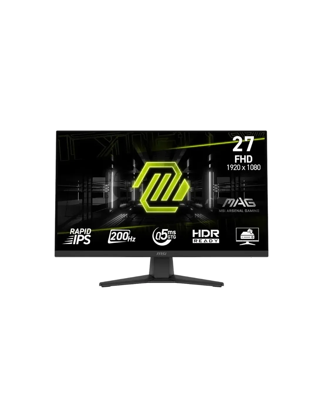 Marca MSI Modelo 9S6-3CE51T-008 Pantalla - Tamano: 27" - Area activa: 597,888 x 336,312 mm - Resolucion: 1920 x 1080 FHD - Frecuencia de actualizacion: 200 Hz - Tiempo de respuesta: 0,5 ms GtG / 1 ms MPRT - Panel Rapid IPS - Brillo SDR: 300 cd/m2 - Contraste: 1.000:1 - DCR: 100.000.000:1 - Frecuencia de senal: 30~230 KHz H / 48~200 Hz V - Angulo de vision: 178(H) / 178(V) - Relacion de aspecto: 16:9 - Paso de pixeles: 0,3114 x 0,3114 mm - Colores de pantalla: 1,07B - Color bit: 10 bits 8 bits + FRC - Tratamiento superficie anti-glare - HDR Ready Conexion - 1 x HDMI 2.0b - 1 x DisplayPort 1.2a - 1 x Salida de auriculares Caracteristicas Funciones - FreeSync Premium - Rango FreeSync: 48~200 Hz - Kensington Lock - Console Mode - HDMI CEC - Firmware Update Ergonomia - Inclinacion: -5 a 20 grados - Montaje VESA 100 x 100 Potencia - Fuente de alimentacion interna - Entrada de energia: 100~240 V 50/60 Hz - Consumo anual: 31 kWh - Consumo standby: 0,5 W - Consumo apagado: 0,3 W Dimensiones y peso - Con soporte: 612,6 x 249,8 x 440 mm - Sin soporte: 612,6 x 54 x 364,8 mm - Soporte: 339,8 x 249,8 x 140,2 mm - Peso neto: 3,9 kg - Peso sin soporte: 3,5 kg Contenido - 1 x Cable HDMI 2.0b - 1 x Cable de alimentacion C13 - 1 x Guia rapida Fecha de revision 24-02-2026 por IS