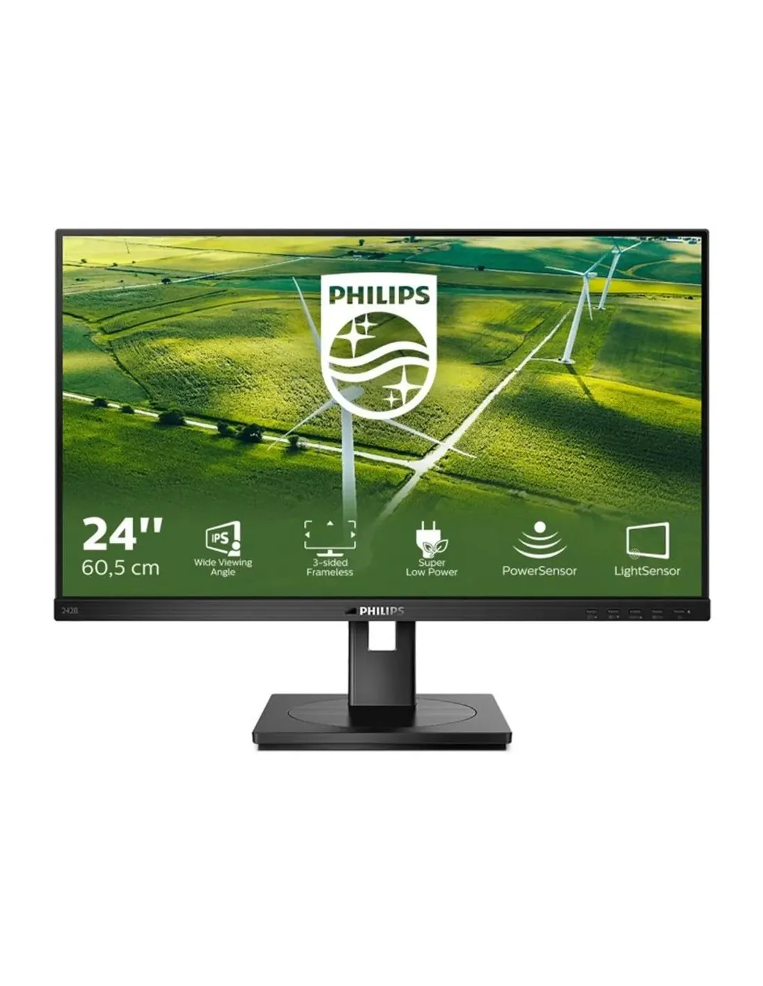 Características del Monitor Philips 242B1G/00 23.8" IPS Full HDEl monitor **Philips 242B1G/00** está diseñado para ofrecer un equilibrio perfecto entre **rendimiento profesional, comodidad visual y eficiencia energética**. Con una pantalla de 23.8" Full HD y tecnología IPS, garantiza una calidad de imagen sobresaliente desde cualquier ángulo. Su enfoque en la sostenibilidad lo convierte en una excelente opción tanto para oficinas como para usuarios que buscan reducir el consumo eléctrico sin comprometer la productividad.Eficiencia energética con tecnologías inteligentesEste monitor forma parte de la serie Philips B-Line con enfoque ecológico, integrando funciones como PowerSensor, que detecta la presencia del usuario y reduce el brillo para ahorrar hasta un 80% de energía. También incorpora un modo de bajo consumo que optimiza el rendimiento sin sacrificar calidad de imagen.PowerSensor: detecta presencia y ajusta el brilloModo de bajo consumo: optimiza el rendimiento energéticoDiseño sostenible: fabricado con materiales reciclablesCalidad de imagen con tecnología IPSLa pantalla IPS de 23.8" ofrece una resolución Full HD con colores vivos, detalles precisos y amplios ángulos de visión. Con su superficie antirreflejos y una frecuencia de actualización de 75 Hz, es ideal para trabajos prolongados y contenido multimedia.Resolución: 1920 x 1080 (Full HD)Frecuencia de refresco: 75 HzTiempo de respuesta: 4 msTecnología IPS con superficie mateConectividad versátil y puertos USB 3.2El Philips 242B1G/00 está equipado con múltiples entradas de vídeo y un hub USB 3.2 de 4 puertos para facilitar la conexión de periféricos. Ideal para usuarios que trabajan con varios dispositivos simultáneamente.Conectores: VGA, DVI, HDMI 1.4, DisplayPort 1.24 puertos USB 3.2Salida de audio integradaComodidad visual y ergonómicaDiseñado para largas jornadas de trabajo, cuenta con funciones ergonómicas avanzadas y modos pensados para el cuidado visual. Gracias al modo LowBlue y a la posibilidad de ajustar altura, inclinación, giro y pivote, se adapta completamente a tu espacio y postura de trabajo.Ajuste de altura: hasta 150 mmGiro: -180° / +180°Inclinación: -5° / +35°Pivote: -90° / +90°Modo LowBlue para reducir la fatiga ocularAudio integrado y montaje VESAIncluye altavoces estéreo de 2W cada uno, ideales para un uso básico de sonido sin necesidad de altavoces externos. También es compatible con montaje VESA 100 x 100 mm para una instalación flexible en brazos o soportes.Altavoces: 2 x 2WCompatibilidad VESA: 100 x 100 mmContenido de la cajaEl monitor viene completamente equipado para empezar a usarlo desde el primer momento.Monitor Philips 242B1G/00Cables: HDMI, DisplayPort, corriente alternaGuía de configuración rápidaManual de usuarioOtras especificacionesDimensiones con soporte: 540 x 501 x 205 mmDimensiones sin soporte: 540 x 323 x 47 mmPeso con soporte: 4.92 kgPeso sin soporte: 3.32 kg