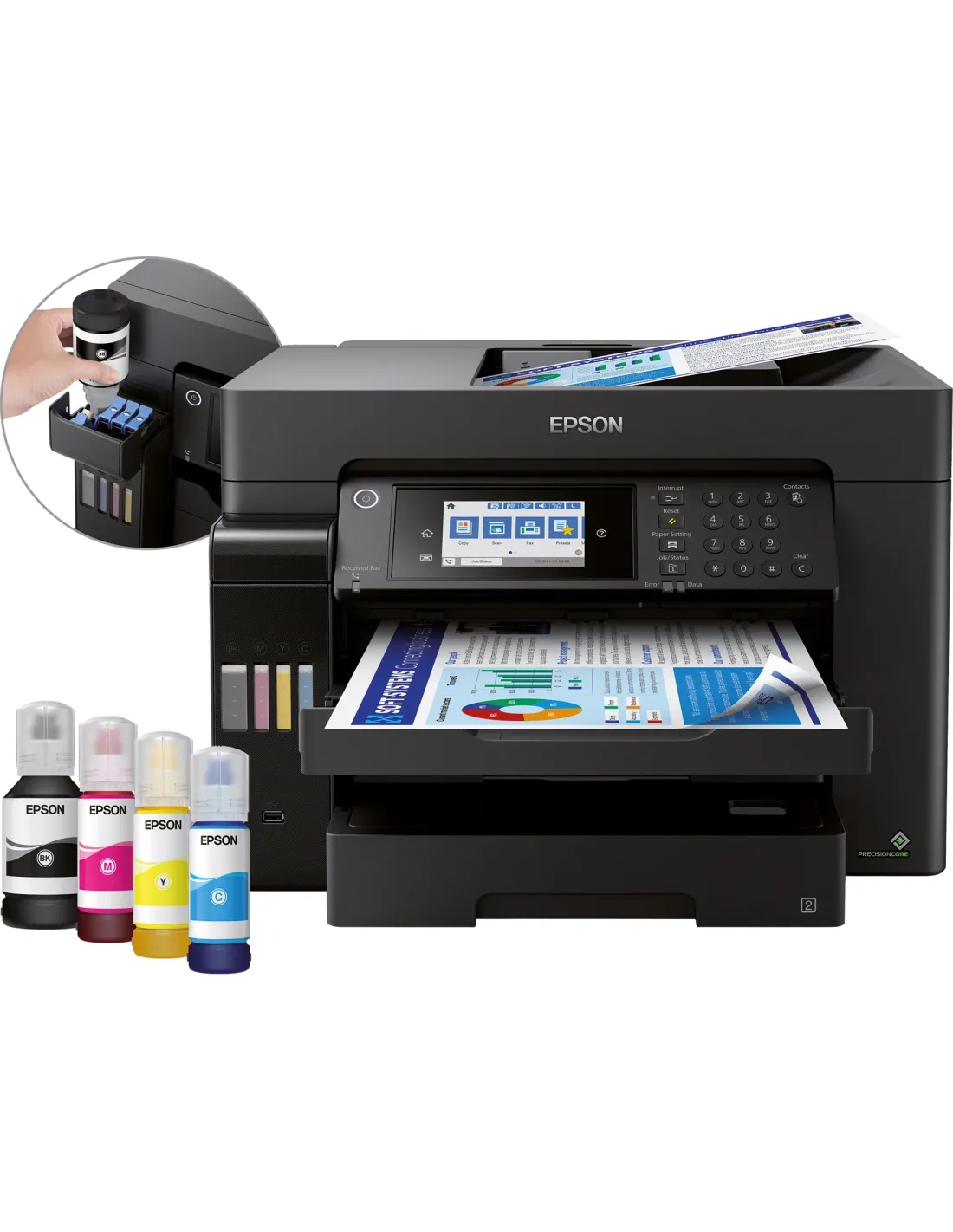 Epson EcoTank ET-16655. Tecnología de impresión: Inyección de tinta, Impresión: Impresión a color, Resolución máxima: 4800 x 1200 DPI, Velocidad de impresión (color, calidad normal, A4/US Carta): 32 ppm. Copiando: Copia a color. Escaneando: Escaneo a color, Resolución óptica de escáner: 1200 x 2400 DPI. Enviando por fax: Fax a color. Funciones dúplex: Copiar, Imprimir, Escanear. Tamaño máximo de papel ISO A-series: A3. Wifi. Impresión directa. Color del producto: Negro