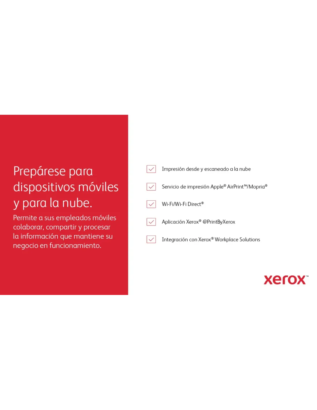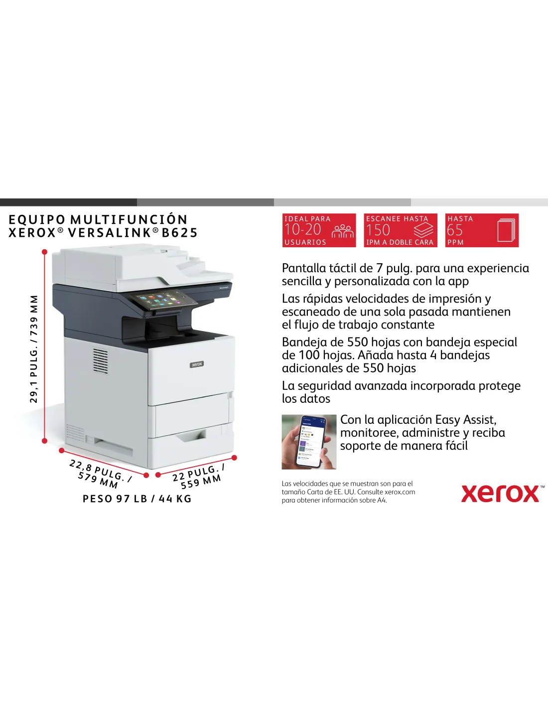 Xerox VersaLink B625 A4 61 ppm Copia/impresión/escaneado/fax a doble cara PS3 PCL5e/6 2 bandejas 650 hojas