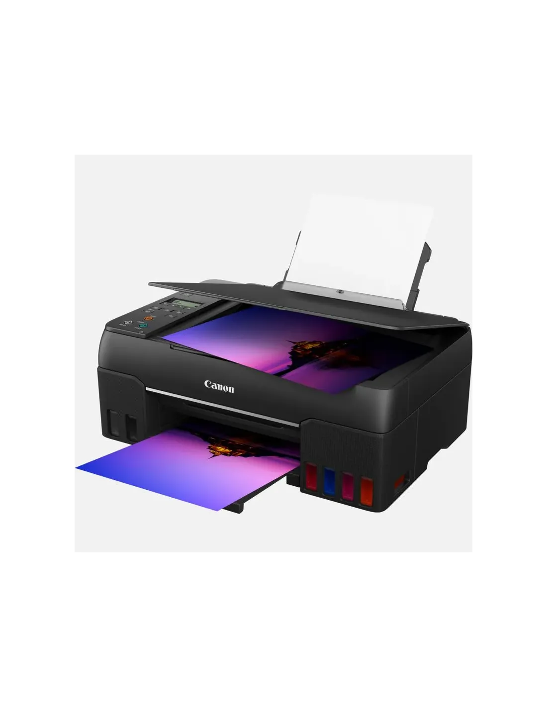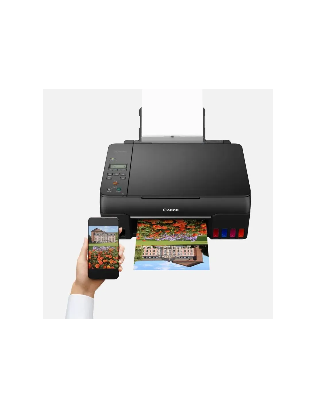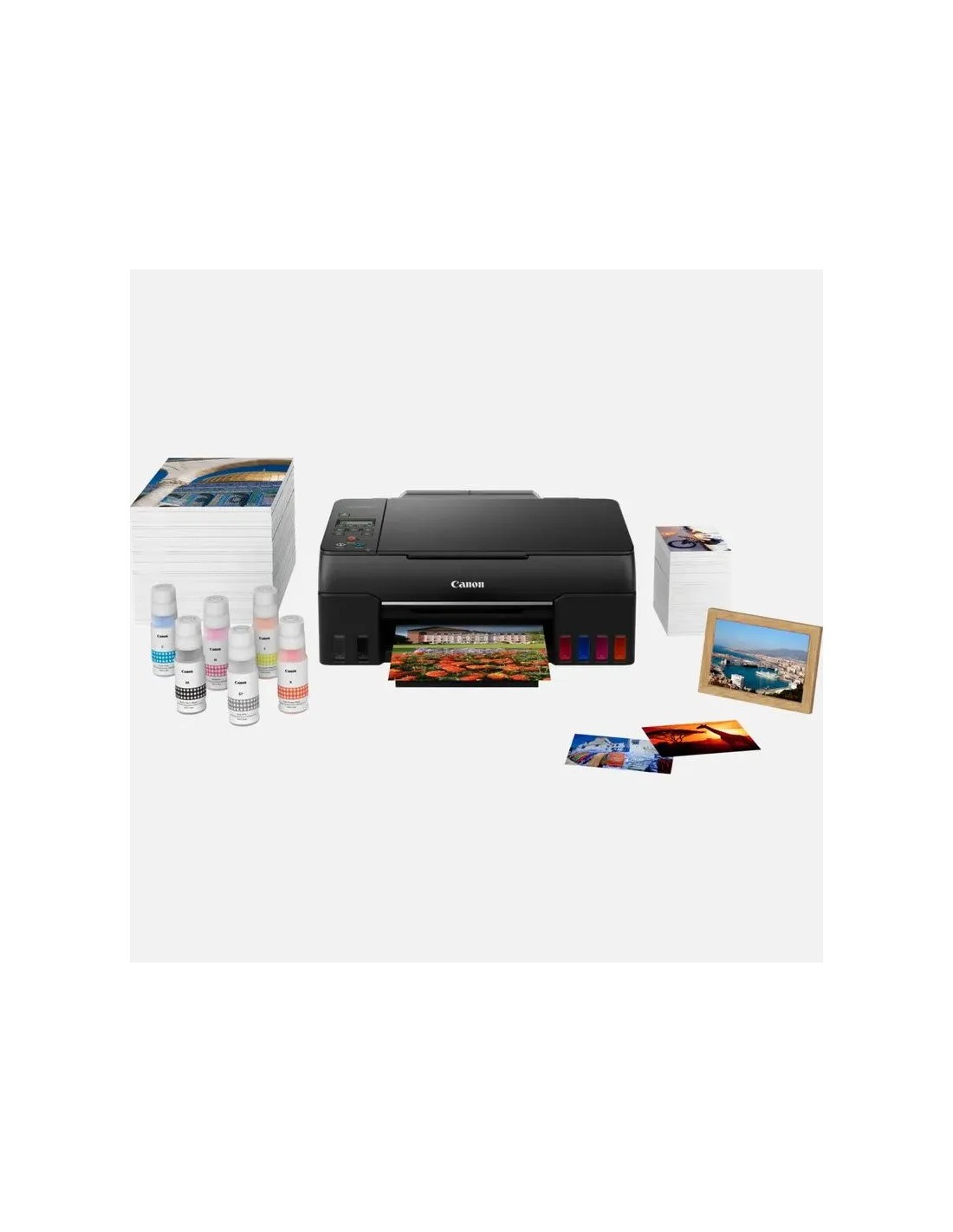 Marca Canon Modelo 4620C006 Impresión - Resolución de impresión: Hasta 4800 x 1200 ppp - Tecnología de impresión: 2 cabezales de impresión FINE (izquierdo: BK/R/GY; derecho: C/M/Y) Impresora con depósito de tinta rellenable - Velocidad de impresión en blanco y negro: aprox. 3,9 ipm - Velocidad de impresión en color: aprox. 3,9 ipm - Velocidad de impresión fotográfica: 10 x 15 cm sin bordes: aprox. 47 segundos - Impresión sin bordes: A4, LTR, 4" x 6" (10 x 15 cm), 5" x 7" (13 x 18 cm), 7" x 10" (18 x 25 cm), 8" x 10" (20 x 25 cm), Cuadrado 5" x 5” (127 x 127 mm), Cuadrado 3,5” x 3,5" (89 x 89 mm), Tamaño de tarjeta 55 x 91 mm(2,17" x 3,58") - Impresión a dos caras: Funcionamiento manual Escaneado - Tipo de escáner: Escáner plano CIS para fotos y documentos - Resolución del escáner (óptica): 600 x 1200 ppp - Velocidad de escaneo por línea: Color: 3,5 ms/línea (300 ppp) Escala de grises: 1,5 ms/línea (300 ppp) - Profundidad de escaneo (entrada/salida) Color: RGB cada 16 bits/8 bits Escala de grises: 16 bits/8 bits - Tamaño máximo del documento: A4/LTR Copia - Velocidad de copia sFCOT: aprox. 25 segundos sESAT: aprox. 2,9 ipm - Copia múltiple: 99 copias (máx.) - Funciones de copia: Copia de documentos, copia fotográfica, copia sin bordes, copia dos en uno y cuatro en uno, copia con eliminación de bordes, copia de carné de identidad - Copia con zoom 25 - 400 % (en incrementos de un 1 %) Ajuste a página De A5 a A4, de B5 a A4, de A4 a A5 y de A4 a B5 Interfaz - LCD de matriz de puntos completa (blanco y negro) Conectividad - Interfaz estándar USB de alta velocidad (puerto USB B) Wi-Fi: IEEE802.11 b/g/n Seguridad Wi-Fi: WPA-PSK, WPA2-PSK, WEP, contraseña de administración Banda de frecuencia de LAN inalámbrica: 2,4 GHz Wi-Fi PictBridge - Apps móviles Aplicación Canon PRINT Inkjet/SELPHY Aplicación Creative Park Aplicación Easy-PhotoPrint Editor - Funciones de impresora Software Easy-PhotoPrint Editor PIXMA Cloud Link (impresión solo desde smartphones o tablets) Complemento Canon Print Service (Android) Apple AirPrint Wireless Direct Mopria (Android) - Asistente inteligente y ayuda de automatización Amazon Alexa™ Google Assistant™ Manejo de papel - Tipos de papel Papel normal Papel fotográfico Pro Luster (LU-101), Papel fotográfico Brillo II (PP-201) Papel fotográfico Mate (MP-101), Papel fotográfico Brillo de «uso diario» (GP-501) Papel de alta resolución (HR-101N), Papel fotográfico Plus Semi Brillante (SG-201), Premium Fine Art Rough <FA-RG1> Papel fotográfico adhesivo (RP-101) Papel fotográfico magnético (MG-101) Papel de transferencia térmica para tejidos oscuros (DF-101), Papel de transferencia térmica para tejidos claros (LF-101), Papel mate de doble cara (MP-101D) Tarjeta de felicitación (fabricada por Avery y RedRiverPaper) Cartulina (fabricada por Neenah Paper e INKPRESS) Canon Red Label Superior (WOP111) Canon Oce Office Colour Paper (SAT213) - Entrada máxima de papel: Bandeja posterior 64–105 g/m² o papel original de Canon compatible - Tamaños del papel A4, A5, B5, A6, LTR, LGL, 4" x 6" (10 x 15 cm), 5" x 7" (13 x 18 cm), 7" x 10" (18 x 25 cm), 8" x 10" (20 x 25 cm), Cuadrado 5” x 5" (127 x 127 mm), Cuadrado 3,5” x 3,5" (89 x 89 mm), Tamaño de tarjeta 55 x 91 mmm (2,17” x 3,58”) Sobres (DL, COM10, C5, Monarca) Ancho 55–216 mm; largo 89–1200 mm - Gramaje del papel: Bandeja posterior: papel normal 64–105 g/m² o papel original de Canon compatible General - Peso: aprox. 6,6 kg - Dimensiones (An. x Pr. x Al.) Aprox. 445 x 340 x 167 mm (bandejas retraídas) Aprox. 445 x 555 x 238 mm (bandejas extendidas) - Niveles de ruido: aprox. 50,5 dB (A) - Entorno operativo recomendado: Temperatura: 5-35 °C; Humedad: 10-90 % HR (sin condensación) - Fuente de alimentación: CA 100-240 V, 50/60 Hz - Consumo eléctrico Apagada: aprox. 0,2 W En espera (conexión USB a PC): aprox. 0,6 W En espera (todos los puertos conectados): aprox. 1,2 W Tiempo para entrar en modo en espera: 11 minutos 4 segundos Copia: aprox. 16 W - Consumo eléctrico típico: 0,18 kWh Consumibles y rendimientos - Botellas de tinta estándar GI-53 <BK> GI-53 <C> GI-53 <M> GI-53 <Y> GI-53 <R> GI-53 <GY> - Cartucho de mantenimiento: MC-G02 (sustituible por el usuario) - Rendimiento de la botella (papel normal) Impresión de documentos en color A4 Negro: 3700 páginas Color: 8000 páginas - Rendimiento de la botella (papel fotográfico) Impresión fotográfica de 10 x 15 cm en color Color: 3800 fotografías Fecha Revisión 28-12-2021 por MSB