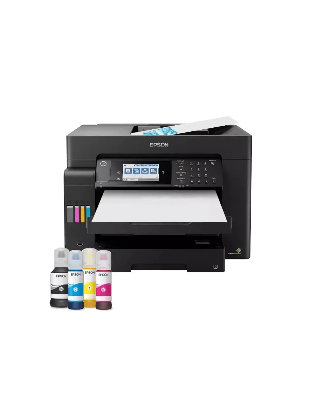 Marca Epson Modelo C11CH71411 Impresión - Cabezal de impresión PrecisionCore - Tecnología de tinta: pigment ink Metodo de impresión - Configuración de inyectores: 800 inyectores negro, 800 inyectores por color - Tamaño máximo de gota: 3,8 pl - Resolución de impresión: 4.800 x 1.200 ppp - Velocidad de impresión ISO/IEC 24734: 25 ppm monocromo y color - Velocidad de impresión (papel normal 75 g/m2): 32 ppm monocromo y color - Velocidad de impresión dúplex ISO/IEC: 21 ppm A4 monocromo y color - Tiempo de salida de primera página: 5,5 s monocromo y color - Ciclo de carga de trabajo recomendado: 3.300 páginas mensuales Copia - Copia mediante ADF - Copia a doble cara automática (A4 y A3, papel normal) Escáner - Tipo de escáner: sensor de imagen de contacto (CIS) - Escaneado a doble cara - Resolución de escaneado: 1.200 x 2.400 ppp - Velocidad de escaneo A4 negro: 26 ipm (una cara ADF), 11,5 ipm (doble cara ADF) - Velocidad de escaneo A4 color: 9 ipm (una cara ADF), 6 ipm (doble cara ADF) - Formatos de salida: BMP, JPEG, TIFF, TIFF múltiple, PDF, PNG Manejo del papel - Dúplex automático en A4 y A3 - Alimentador automático de documentos: 50 hojas - Capacidad de entrada de papel: 550 hojas - Capacidad de salida: 125 hojas Tamaño del papel - A3+, A3, A4, A5, A6, B6 - Sobres DL y No. 10 Gramaje del papel - De 64 a 300 g/m2 Otras Características Consumo de energía - Copia autónoma: 19 W - Modo ahorro: 0,8 W - Preparado: 9,5 W - Desconectado: 0,2 W - TEC: 0,14 kWh/semana Red - Ethernet - Wi-Fi - Wi-Fi Direct - Seguridad WLAN: WEP 64 bits, WEP 128 bits, WPA-PSK (TKIP) Sistemas operativos - Windows XP, Vista, 7, 8, 8.1, 10 (32 y 64 bits) - Windows Server 2003, 2008 R2, 2012 R2, 2016 - macOS 10.6.8 o posterior Dimensiones y pesos - 515 x 500 x 350 mm - 21 kg Consumibles - Rendimiento tinta negra: 4.500 páginas - Rendimiento color: 2.800 páginas   Fecha Revisión 12-01-2026 por IS