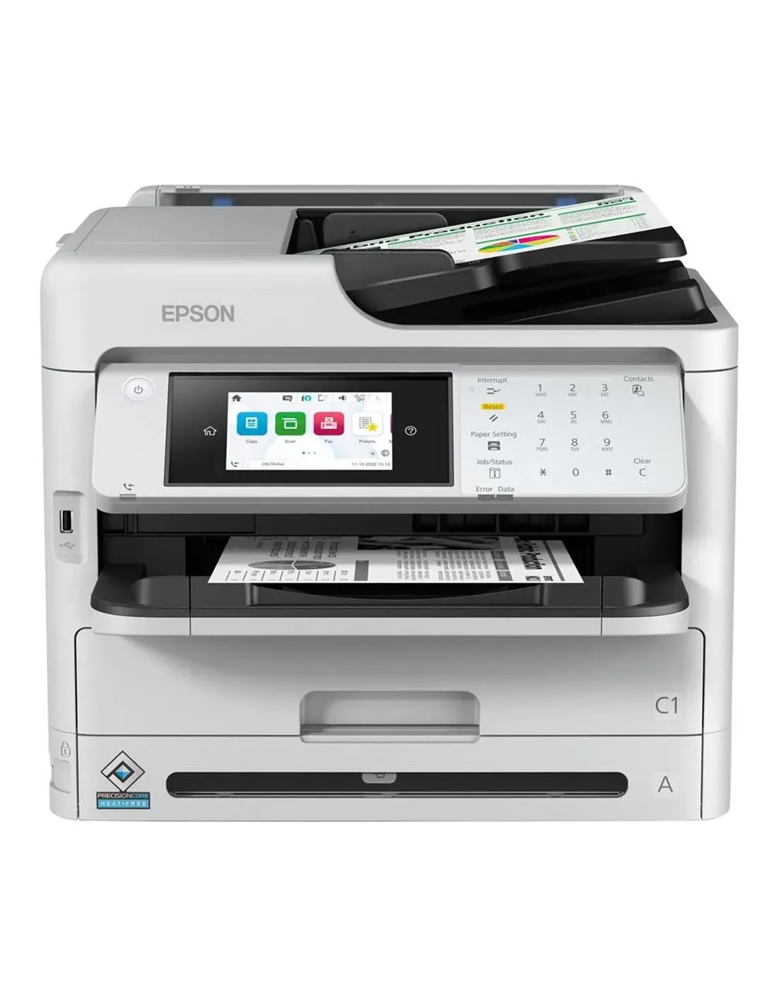 Características de la Epson WorkForce Pro WF-M5899DWF - Impresora Multifunción B/NLa Epson WorkForce Pro WF-M5899DWF es una impresora multifunción monocromo diseñada para entornos profesionales que requieren alto volumen de impresión, velocidad y fiabilidad. Gracias a su tecnología de inyección de tinta PrecisionCore, ofrece una calidad nítida y costes operativos optimizados, siendo ideal para oficinas con cargas de trabajo exigentes y necesidades avanzadas de conectividad.Rendimiento profesional para grandes volúmenesPreparada para ciclos de trabajo intensivos, esta impresora alcanza un ciclo mensual máximo de 75.000 páginas y un volumen recomendado de entre 500 y 5.000 páginas al mes. Su velocidad de impresión y su rápido tiempo de salida de la primera página mejoran la productividad diaria.Hasta 25 ppm (ISO/IEC 24734) y hasta 34 ppm en B/NPrimera página en solo 4,8 segundosResolución de impresión hasta 1.200 x 2.400 pppTecnología Epson PrecisionCore con 1.600 inyectoresTintas Epson DURABrite UltraMultifunción completa con dúplex automáticoIntegra funciones de impresión, copia, escaneado y fax, todas con capacidad dúplex automática para ahorrar papel y tiempo. Su alimentador automático de documentos facilita el trabajo con documentos de varias páginas.Impresión, copia, escáner y fax en un solo equipoDúplex automático en impresión, copia y escaneadoADF de 50 hojasResolución de copia hasta 600 x 1.200 pppResolución óptica de escaneado 1.200 x 2.400 pppConectividad avanzada y seguridad empresarialGracias a su conectividad USB 2.0, Gigabit LAN y Wi-Fi (ac), permite integración sencilla en redes corporativas. Es compatible con AirPrint y ofrece impresión desde dispositivos móviles, además de escaneo a correo electrónico, FTP, carpeta o nube.Wi-Fi Direct y compatibilidad con AirPrintProtocolos de seguridad: SSL, TLS, IPsec, WPA3-SAE, 802.1xCompatibilidad con IPv6 y SNMP 3Emulaciones PCL 5c, PCL 5e, PCL 6 y PostScript 3Gestión eficiente del papelOfrece una capacidad estándar de 330 hojas, ampliable hasta 1.830 hojas, adaptándose a diferentes volúmenes de trabajo. Es compatible con múltiples tamaños y tipos de papel, incluyendo sobres y etiquetas.Bandeja de entrada de 250 hojasBandeja multiusos de 80 hojasBandeja de salida de 150 hojasSoporta A4, A5, A6, B5, Letter, Legal, sobres y másGramaje admitido: 64 a 256 g/m²Fax profesional integradoEl fax Super G3 de alta velocidad permite envío y recepción rápida de documentos, con funciones avanzadas pensadas para entornos de oficina.Velocidad de transmisión hasta 33.6 KbpsMemoria para hasta 550 páginas200 marcaciones rápidasFax desde PC y función de correo electrónicoDiseño robusto y eficiencia energéticaCon un diseño compacto dentro de su categoría y un consumo optimizado, esta impresora combina alto rendimiento y eficiencia energética, reduciendo el impacto en costes operativos.Consumo en funcionamiento: 30 WConsumo en reposo: 1,2 WPantalla LCD táctil en colorDimensiones: 42,5 x 53,5 x 35,7 cmPeso: 19 kgOtras especificacionesElemento de escaneado CISTamaño mínimo de gota: 3,8 plTecnología Variable Sized DropletCapacidad máxima de copias: 999Ampliación de copia hasta 400% y reducción hasta 25%Compatibilidad con Windows, macOS y Windows ServerSoftware incluido: Controladores, utilidades y Epson Document Capture ProCartucho negro incluidoEmisión sonora: 50 dBA en funcionamiento
