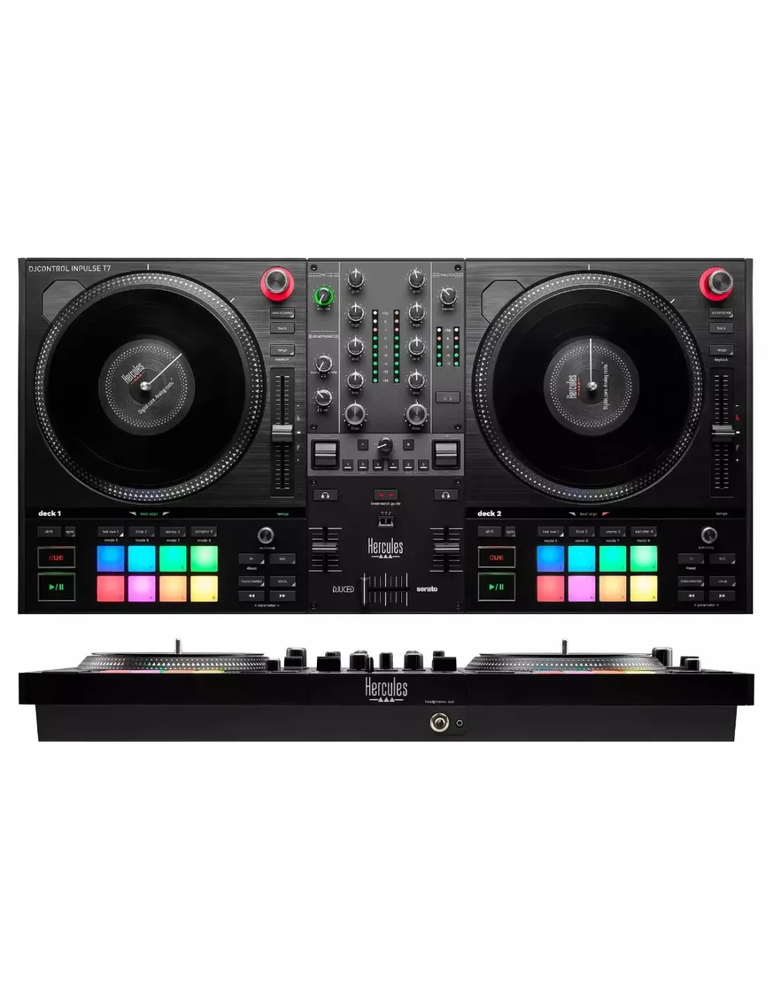 Hercules DJ Control INPULSE T7 Controladora DJCon 2 giradiscos duales motorizadosRuedas Jog de 7" motorizadas con detección táctil (sensación de vinilo)Beat Match GuideSelección de efectos, interruptor Rocker de efectos y control de efectos2 salidas master XLR + 2 salidas RCA (RCA)Salidas de auriculares de 3,5 mm y 6,3 mmEntrada de micrófono (jack de 6,3 mm balanceado)Interfaz de audio: 44,1 kHz / 24-bitsSoftware Serato DJ Lite (upgrade opcional a Serato DJ Pro) y DJUCEDCable trenzado USB-A a USB-BDimensiones: 652 x 350 x 90 mmPeso: 5 kgControles por Deck:GananciaFader de tono de 100 mmFader de volumenControl de filtroEcualizador de 3 bandasMedidor VUPlay/Pause, Cue, Shift, Sync y 8 pads RGB con 8 modos (Hot Cue, Loop, Stems...)Vinyl, Slip, QuantizeBotones de entrada/salida de bucleControles Generales:Potenciómetro de volumen principalCrossfaderPotenciómetro de volumen de auricularesPotenciómetro 'Cue/Mix'
