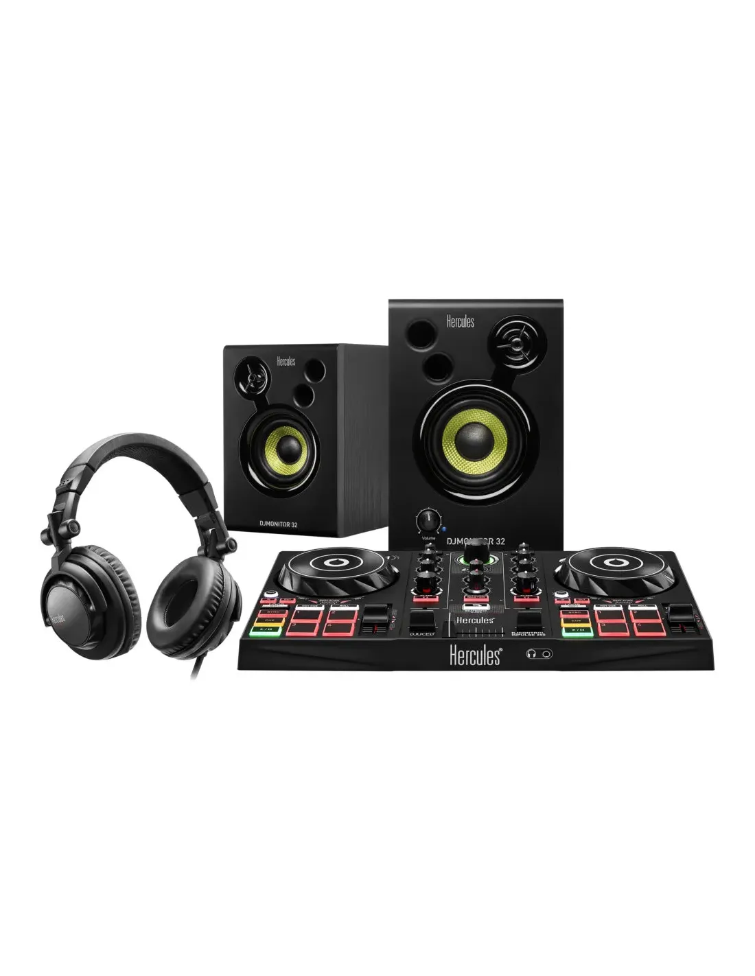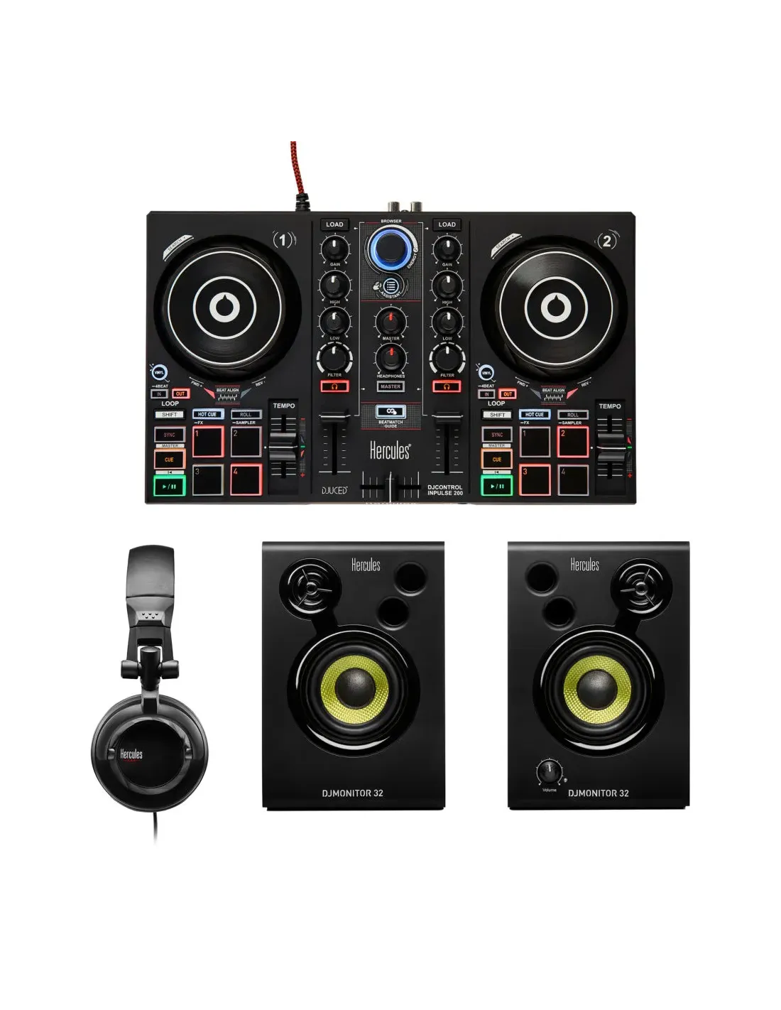 Aprende a mezclar y conviértete en DJ. Mezcla en el controlador Hercules DJControl Inpulse 200 MK2 con el software Serato DJ Lite y DJUCED®. Monitoriza las pistas siguientes con los auriculares HDP DJ45. Reproduce tu mezcla en los altavoces DJMonitor 32.Características principales:Todo lo que necesitas para empezar y convertirte en DJ:Controlador DJ de 2 decks con interfaz de audio integradaSoftware Serato DJ Lite y DJUCED® para Windows®/macOSAltavoces activos (2 x 15 W RMS) para mezclar en casaAuriculares DJ para monitorizar las próximas pistasPerfecto para ayudarte a aprender a pinchar:Los tutoriales en vídeo te ayudan a aprender a pincharLas guías Beatmatch de DJControl Inpulse 200 MK2 te ayudan a sincronizar 2 pistas entre sí mediante los faders de tempo y las jog wheelsUltraportátil:Fácil de transportar: equipo de DJ compacto y ligeroFácil de instalar: sencilla instalación del software y sólo 4 cables para conectar (USB, altavoces, alimentación y auriculares)Contenido del paquete:Controlador DJControl Inpulse 200 MK2 con cable USB fijoAltavoces DJMonitor 32, cable de alimentación, cable de audioAuriculares HDP DJ45 + adaptador jack 3,5 mm/6,35 mmLicencias DJUCED® y Serato DJ LiteManual de instrucciones + folleto con información sobre la garantía de cada componente