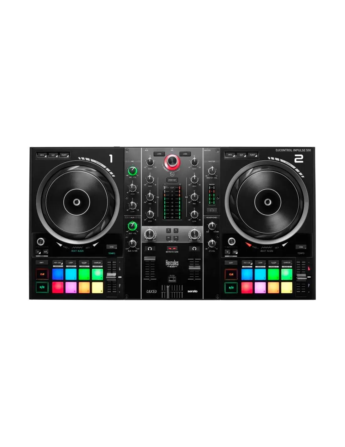 Hercules Inpulse 500. Micrófono: 6,3 mm, Auriculares: 3,5 mm/6,35 mm. Tipo de fuente de alimentación: USB. Sistema operativo Windows soportado: Windows 10, Sistema operativo MAC soportado: Mac OS X 10.12 Sierra, Mac OS X 10.13 High Sierra, Mac OS X 10.14 Mojave, Mac OS X 10.15 Catalina,..., Procesador mínimo: Intel Core i3. Ancho: 542 mm, Profundidad: 296 mm, Altura: 70 mm. Cables incluidos: USB, Software incluido: Serato DJ Lite, DJUCED