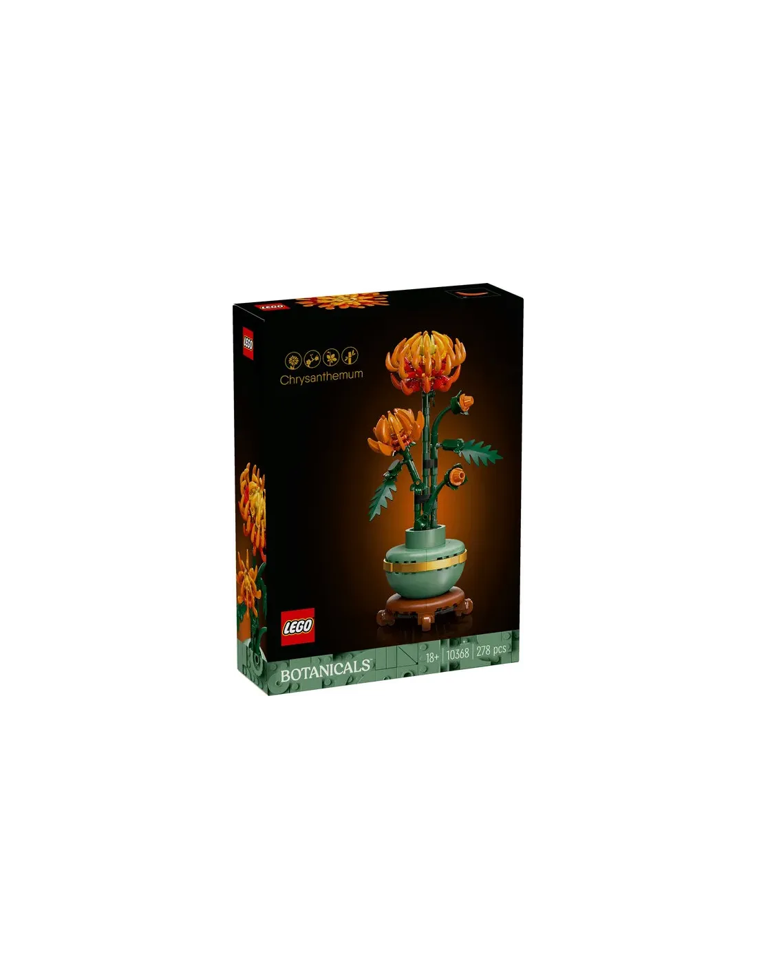 Relájate con el adorno floral del set de construcción para adultos LEGO Icons Crisantemo (10368). El crisantemo es un motivo popular en el arte tradicional y simboliza el otoño en los CuatroCaballeros, un cuarteto clásico de bellas plantas. Disfruta de un fascinante proyecto de construcción u obsequia a alguien especial con este adorno floral atemporal: un regalo perfecto para cualquierocasión.Esta réplica detallada, con hojas y pétalos articulados, incluye vivas flores naranjas en capullo, abriéndose y abiertas, así como una maceta verde pastel con una banda dorada y una peana que imita lamadera. Este modelo de crisantemo, fácil de construir, es un adorno elegante para cualquier espacio, tanto solo como junto a otros sets de la colección LEGO Botanical (se venden por separado).Descubre un espacio de relajación con los originales proyectos de construcción creativa LEGO para adultos. Las instrucciones de construcción digitales están disponibles en la app LEGO Builder.Crisantemo ornamental construible: Disfruta por tu cuenta o en compañía de tus amigos y familiares de un fascinante proyecto con el set de construcción para adultos LEGO Icons CrisantemoContenido de la caja: Este set de construcción creativa incluye todo lo que necesitas para ensamblar un crisantemo, además de una maceta verde pastel con una banda dorada y una peana que imita lamaderaCapullos en floración: El set LEGO Icons Crisantemo, con hojas y pétalos articulados, incluye vivas flores naranjas en distintas etapas de floración (1 abierta, 1 abriéndose y 2 aún en capullo)Decoración sin mantenimiento: Pon una pincelada de color en tu hogar o tu oficina con este crisantemo artificial en macetaPlanta LEGO para regalar: Celebra un cumpleaños o una ocasión especial, o sorprende a un ser querido con un regalo diseñado para fans adultos de los sets de construcción LEGO, la decoración ylas floresInstrucciones de construcción digitales: La app LEGO Builder incluye una versión digital de las instrucciones que vienen con este set de construcción floral LEGOPerteneciente a la colección LEGO Botanical: Descubre un espacio de relajación con la amplia gama de sets de construcción LEGO diseñados expresamente para adultosDimensiones: El crisantemo de este set de construcción de 278 piezas (con la maceta y la peana) mide aproximadamente 26 cm de altura, 10 cm de anchura y 9 cm de profundidad