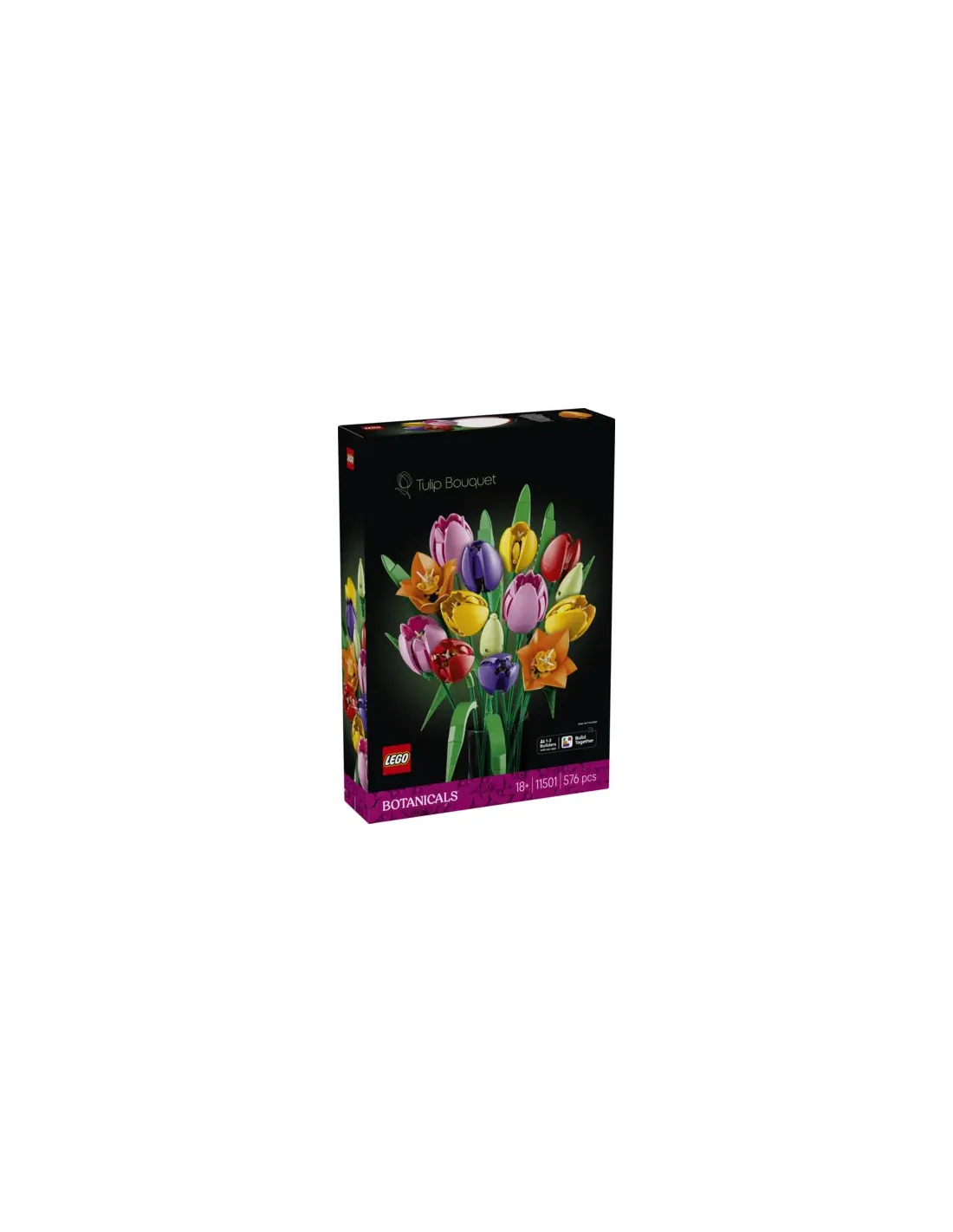 Características del LEGO Botanicals Ramo de Tulipanes (11501)El set LEGO Botanicals Ramo de Tulipanes (11501) es una propuesta creativa ideal para adultos que buscan una experiencia de construcción relajante y decorativa. Diseñado para quienes disfrutan del diseño floral sin preocuparse por el mantenimiento, este set de 576 piezas permite construir un colorido ramo de tulipanes y narcisos que se mantiene siempre en flor. Perfecto como regalo o elemento decorativo, forma parte de la línea LEGO para adultos.Decoración con esencia natural y cero mantenimientoEl set ofrece una experiencia visual y táctil atractiva gracias a su diseño realista y la variedad de colores y formas. Cada flor se arma pieza a pieza, dando como resultado un ramo personalizable que puede exhibirse en cualquier estancia del hogar u oficina.Incluye tulipanes en tonos rosa, rojo, amarillo y moradoContiene narcisos en colores vibrantes como naranja y amarilloLos tallos miden hasta 36 cm de alturaConstrucción creativa para adultosPensado para mayores de 18 años, este set invita a relajarse construyendo flores detalladas con un alto nivel estético. Gracias a su modularidad, las flores pueden combinarse con otros sets de la colección LEGO Botanical para crear composiciones únicas.Recomendado para +18 añosDiseño modular: combina con otros sets floralesIdeal como regalo o decoración permanenteDiseño sostenible y sin necesidad de floreroEl set está fabricado con plástico de origen vegetal, procedente de caña de azúcar, como parte del compromiso de LEGO con la sostenibilidad. El jarrón no está incluido, lo que te permite elegir el recipiente que mejor se adapte a tu estilo personal.Materiales sostenibles en parte de sus componentesNo requiere riego ni cuidadosJarrón no incluidoOtras especificacionesModelo: 11501Número de piezas: 576Dimensiones aproximadas del tallo: 36 cm de altoColección: LEGO BotanicalTipo de producto: Set de construcción para adultos