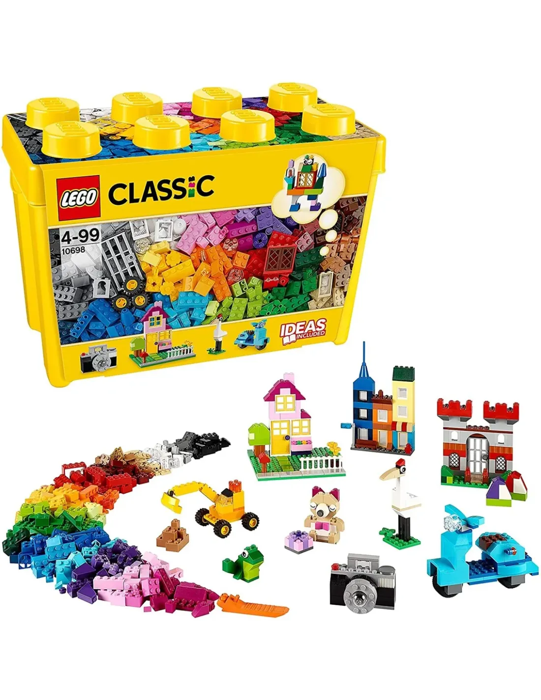 Construye a lo grande con esta enorme caja de ladrillos LEGO®clásicos en 33 colores diferentes. Deja volar la imaginación con lasdiferentes ventanas y puertas, y las demás piezas especiales elegidasespecialmente para inspirarte. Este set contiene todo lo que unpequeño constructor necesita para disfrutar de un poco deconstrucción con LEGO Classic, independientemente de su edad.¡Incluye ideas para ayudarte a dar tus primeros pasos! Viene en unacómoda caja de almacenamiento de plástico y esun complementoideal para cualquier colección LEGO existente.Incluye un amplio surtido de ladrillos LEGO® en 33 colores diferentes.Contiene 8 tipos diferentes de ventanas y puertas con 8 marcosdiferentes.Piezas especiales incluidas: 2 bases verdes de tamaños diferentes, 3juegos de ojos, 6 neumáticos y 6 llantas.LEGO® Classic ha sido diseñado para dar rienda suelta a la creatividadpor medio del ladrillo LEGO.Las piezas especiales fomentan el juego de construcción imaginativo.Las numerosas ventanas y puertas facilitan la construcción conLEGO® Classic.Todos los modelos ilustrados se pueden construir simultáneamente apartir de este set.Ideas incluidas con el set y disponibles en LEGO.com/classic paraayudarte a dar tus primeros pasos.Viene en una útil caja de almacenamiento de plástico.Las bases verdes miden más de 16 cm de longitud y 16 cm de ancho, y12 cm de longitud y 6 cm de ancho, respectivamente.