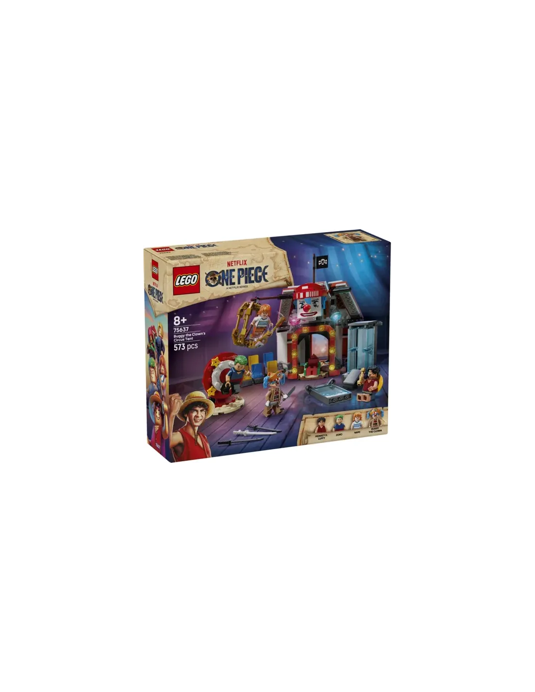 Características del LEGO One Piece Netflix ? Carpa de Circo de BuggyEl set LEGO® ONE PIECE Carpa de Circo de Buggy el Payaso (75637) traslada a niños y niñas a partir de 8 años al universo de la serie de acción real de Netflix. Diseñado para el juego de interpretación y la construcción creativa, este set permite recrear escenas icónicas del anime o inventar nuevas aventuras llenas de acción, personajes carismáticos y desafíos circenses.Personajes icónicos de ONE PIECE en versión LEGOEl set incluye minifiguras detalladas de los protagonistas y del villano principal del circo, ofreciendo múltiples posibilidades narrativas desde el primer momento.Minifiguras de Luffy, Zoro, Nami y Buggy el PayasoAccesorios y armas inspirados en la serieIncluye 2 carteles de "Se busca"Carpa de circo construible con funciones de juegoLa carpa de circo de Buggy es el elemento central del set y está diseñada para ampliar la experiencia de juego gracias a su estructura transformable y a sus zonas interactivas.Carpa que se puede dar la vuelta para crear un espacio de juego más amplioGradas desmontables y trono de BuggyDiseño pensado para el juego activo y narrativoDesafíos circenses para el juego de interpretaciónLos héroes deberán escapar de ingeniosos artilugios circenses mientras se enfrentan a Buggy, fomentando la imaginación y el desarrollo de historias llenas de acción.Tanque de agua para rescatar a LuffyRueda giratoria para liberar a ZoroJaula colgante donde está atrapada NamiConstrucción creativa y experiencia digitalAdemás del juego físico, el set ofrece una experiencia de construcción digital complementaria que ayuda a los peques a seguir su progreso y explorar el modelo en detalle.Compatible con la app LEGO® BuilderInstrucciones 3D con zoom y rotación de modelosPosibilidad de guardar sets y controlar el progresoUn regalo ideal para fans del animeEste set es un regalo perfecto para seguidores de ONE PIECE y amantes de LEGO, combinando construcción, juego activo y coleccionismo en un solo producto.Recomendado para niños y niñas a partir de 8 añosBasado en la serie de acción real de NetflixForma parte de la colección LEGO® ONE PIECEOtras especificacionesNúmero de piezas: 573Altura aproximada: 16 cmAnchura aproximada: 15 cmProfundidad aproximada: 14 cm