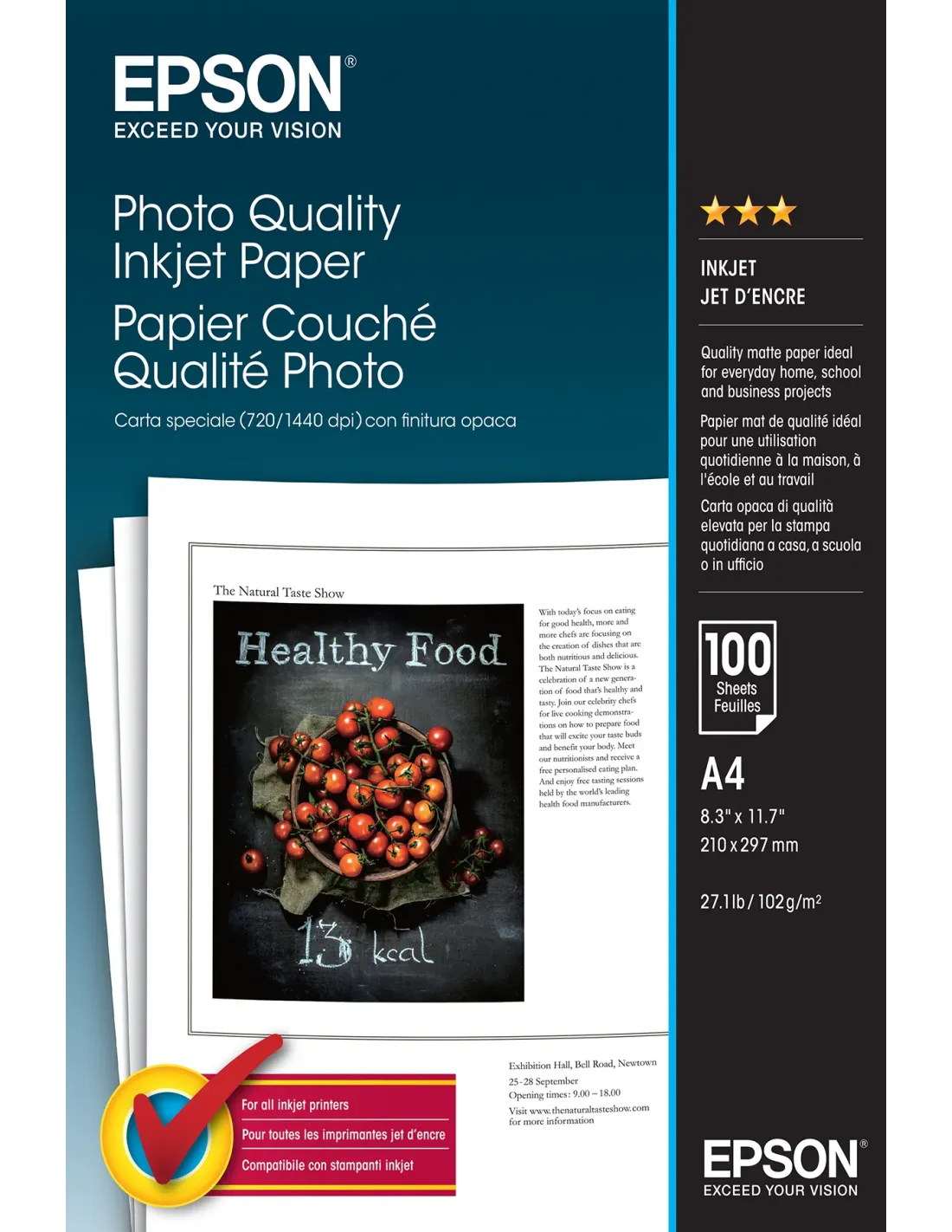 Epson Photo Quality Inkjet Paper - A4 - 100 hojas, Mate, 102 g/m², A4, Blanco, 100 hojas, WorkForce WF-7620DTWF WorkForce WF-7610DWF WorkForce WF-7110DTW WorkForce WF-3640DTWF WorkForce...