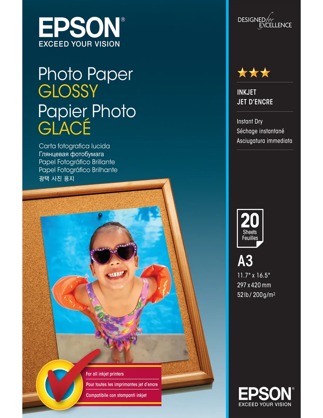 Epson Photo Paper Glossy - A3 - 20 Hojas, Brillo, 200 g/m², A3, 20 hojas, Stylus Photo 1200, Stylus Color 1160, Stylus Photo 1270, Epson Stylus Pro 7000, Epson Stylus Pro..., 1 pieza(s)