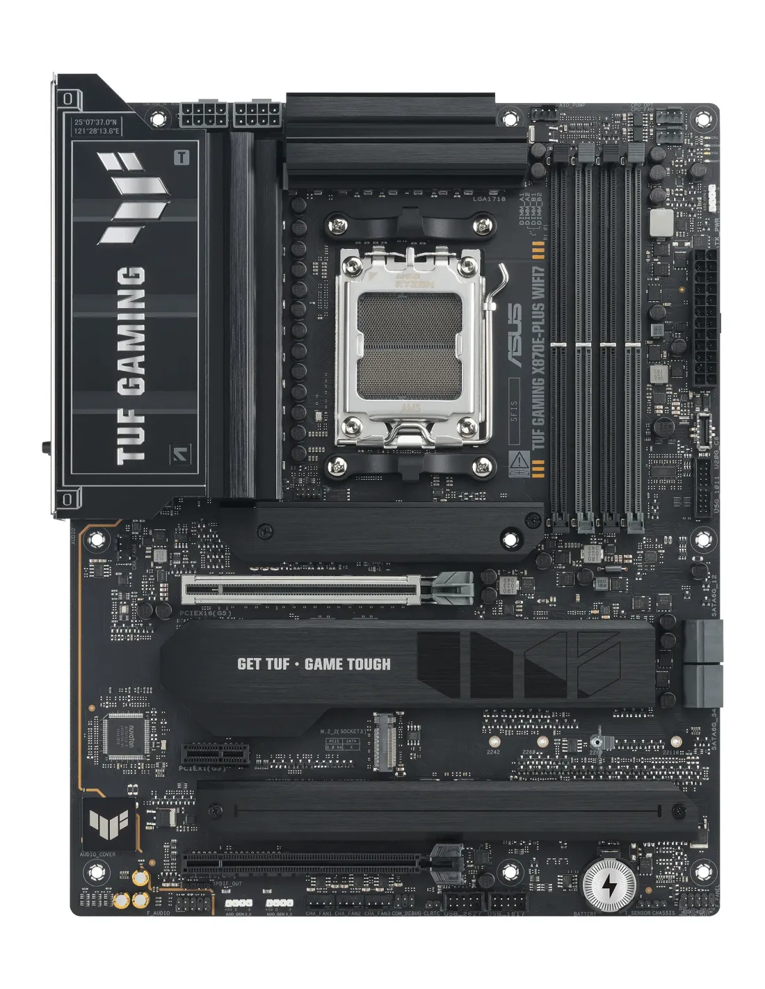ASUS TUF GAMING X870E-PLUS WIFI7. Fabricante de procesador: AMD, Socket de procesador: Zócalo AM5, Procesador compatible: AMD Ryzen 7000 Series, AMD Ryzen 8000 Series, AMD Ryzen 9000 Series. tipos de memoria compatibles: DDR5-SDRAM, Memoria interna máxima: 256 GB, Tipo de ranuras de memoria: DIMM. Interfaces de disco de almacenamiento soportados: M.2, PCI Express 4.0, PCI Express 5.0, SATA III, Tipos de unidades de almacenamiento admitidas: HDD & SSD, Niveles RAID: 0, 1, 5, 10. Tipo de interfaz ethernet: 2.5 Gigabit Ethernet, Estándar Wi-Fi: Wi-Fi 7 (802.11be), Wi-Fi estándares: Wi-Fi 7 (802.11be). Componente para: PC, Factor de forma: ATX, Familia del chipset: AMD