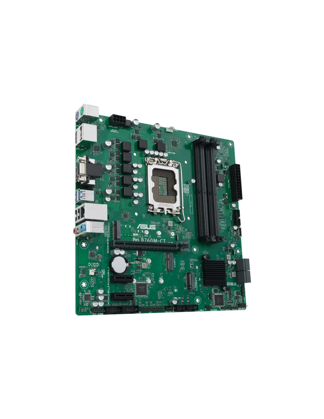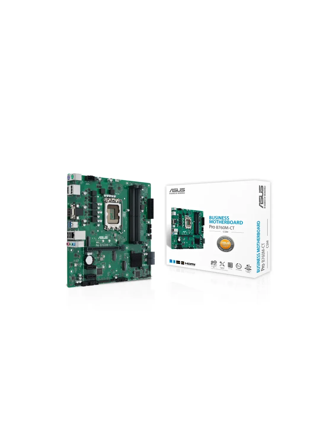 ASUS PRO B760M-CT-CSM. Fabricante de procesador: Intel, Socket de procesador: LGA 1700, Procesador compatible: Intel® Celeron®, Intel® Pentium® Gold, Intel® Core™ i3, Intel® Core™ i5, Intel® Core™.... tipos de memoria compatibles: DDR5-SDRAM, Memoria interna máxima: 128 GB, Tipo de ranuras de memoria: DIMM. Interfaces de disco de almacenamiento soportados: M.2, SATA III, Tipos de unidades de almacenamiento admitidas: HDD & SSD. Tipo de interfaz ethernet: Gigabit Ethernet. Componente para: PC, Factor de forma: micro ATX, Familia del chipset: Intel