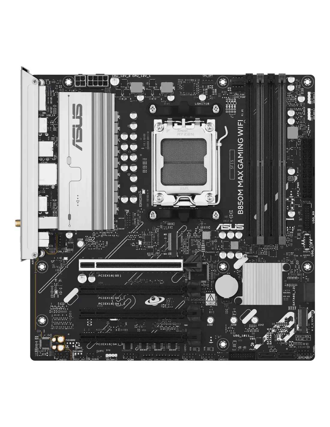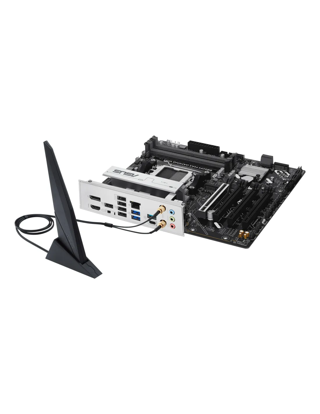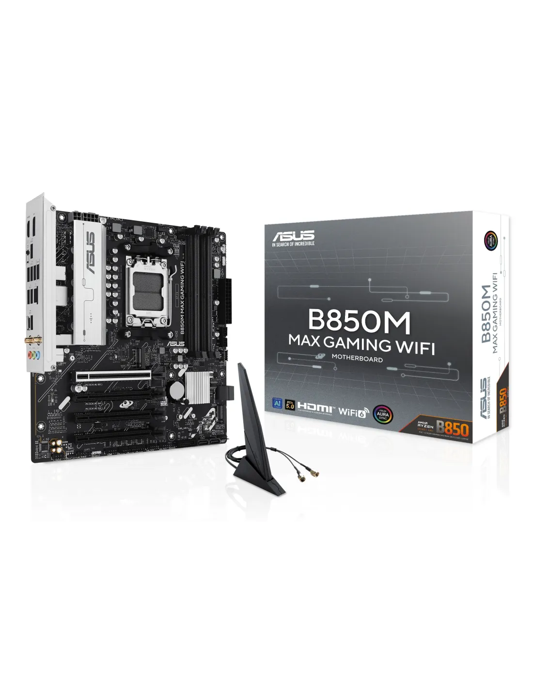ASUS B850M MAX GAMING WIFI. Fabricante de procesador: AMD, Socket de procesador: Zócalo AM5, Procesador compatible: AMD Ryzen 7000 Series, AMD Ryzen 8000 Series, AMD Ryzen 9000 Series. tipos de memoria compatibles: DDR5-SDRAM, Memoria interna máxima: 256 GB, Tipo de ranuras de memoria: DIMM. Interfaces de disco de almacenamiento soportados: M.2, SATA III, Tipos de unidades de almacenamiento admitidas: HDD & SSD, Niveles RAID: 0, 1, 5, 10. Tipo de interfaz ethernet: Gigabit Ethernet, Estándar Wi-Fi: Wi-Fi 6 (802.11ax), Wi-Fi estándares: Wi-Fi 6 (802.11ax). Componente para: PC, Factor de forma: micro ATX, Familia del chipset: AMD