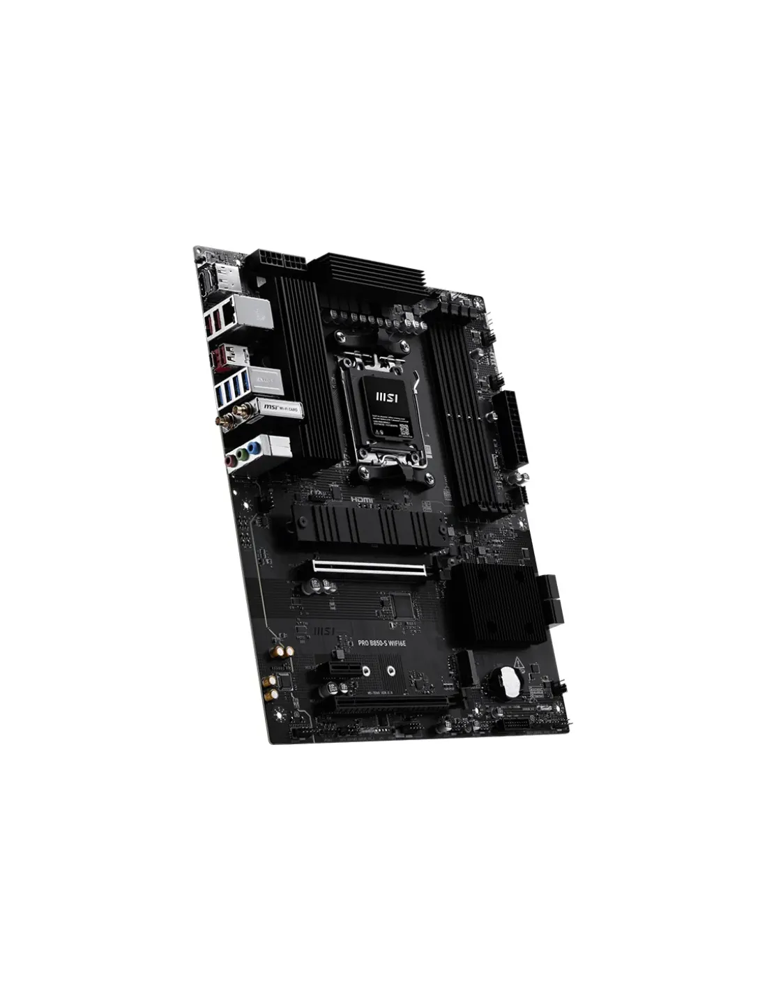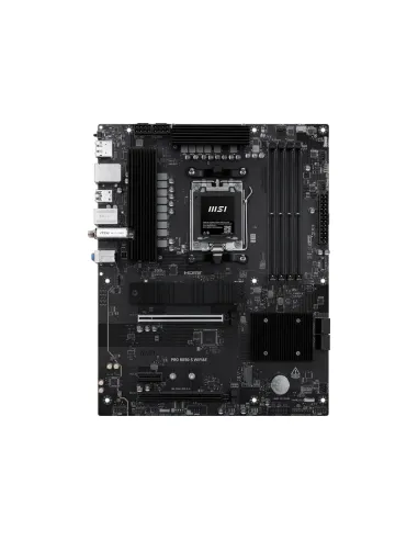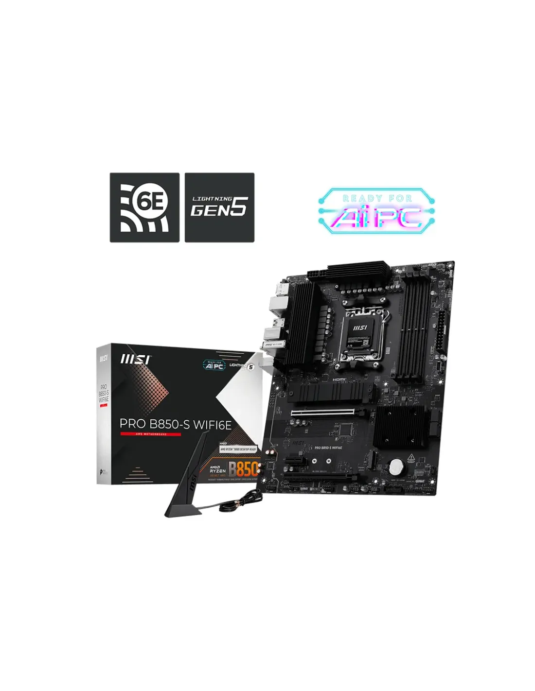 MSI PRO B850-S WIFI6E. Fabricante de procesador: AMD, Socket de procesador: Zócalo AM5, Procesador compatible: AMD Ryzen 7000 Series, AMD Ryzen 8000 Series, AMD Ryzen 9000 Series. tipos de memoria compatibles: DDR5-SDRAM, Memoria interna máxima: 256 GB, Tipo de ranuras de memoria: DIMM. Interfaces de disco de almacenamiento soportados: M.2, SATA, Tipos de unidades de almacenamiento admitidas: HDD & SSD, Niveles RAID: 0, 1, 10. Tipo de interfaz ethernet: 2.5 Gigabit Ethernet, Controlador LAN: Realtek RTL8125, Estándar Wi-Fi: Wi-Fi 6E (802.11ax). Componente para: PC, Factor de forma: ATX, Familia del chipset: AMD