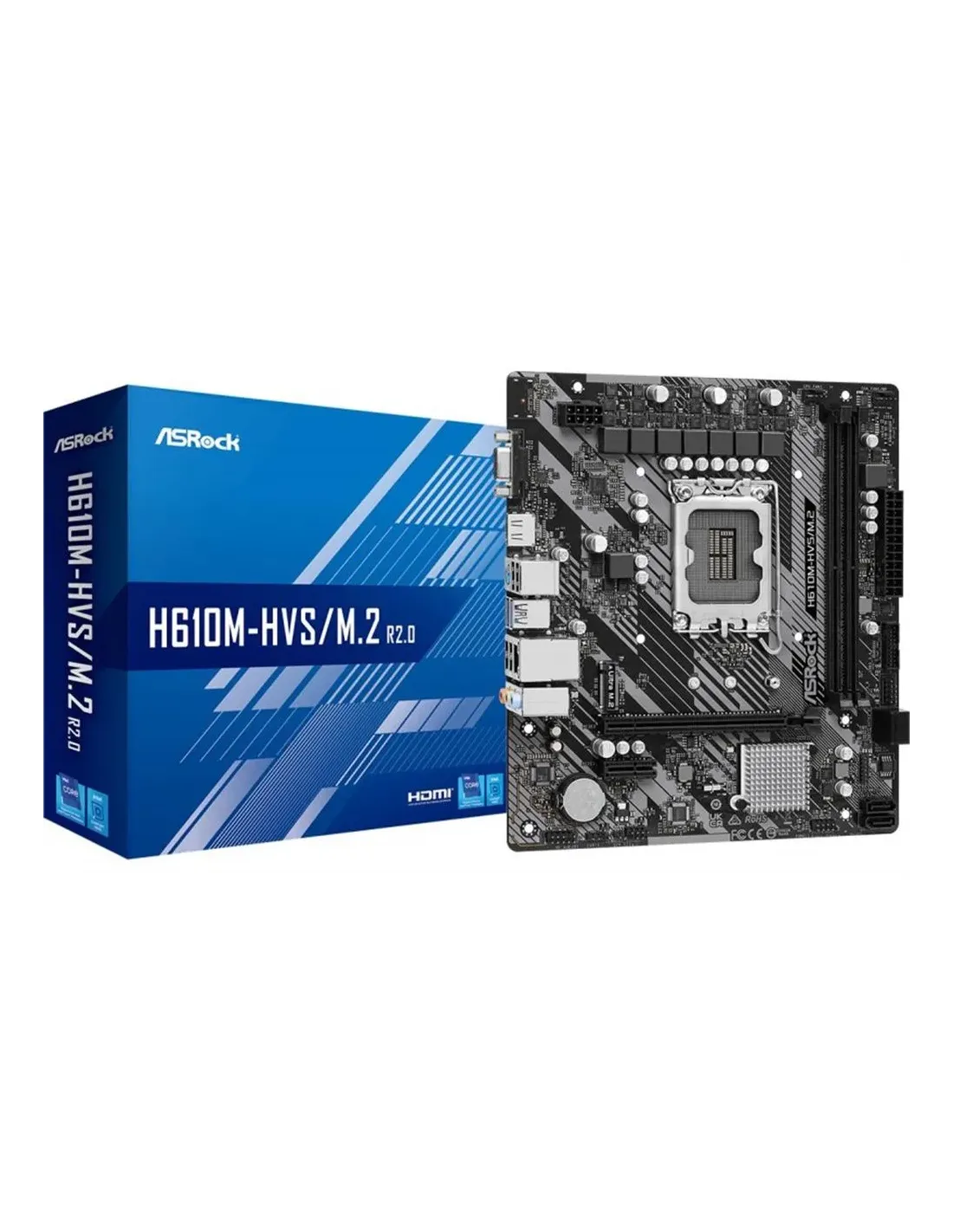 Características de la placa base ASRock H610M-HVS/M.2 (LGA 1700, mATX)La **ASRock H610M-HVS/M.2** es una placa base compacta en formato micro ATX diseñada para sacar el máximo partido a los procesadores **Intel Core de 12ª y 13ª generación**. Ideal para **montajes eficientes y de bajo coste**, esta placa combina conectividad actual, soporte para almacenamiento M.2 y compatibilidad con memorias DDR4 hasta 64 GB. Perfecta para equipos de oficina, uso doméstico o gaming moderado, ofrece estabilidad, fiabilidad y una buena base para configuraciones modernas.Compatibilidad Intel de nueva generaciónEquipada con el socket **LGA 1700** y el chipset **Intel H610**, esta placa es compatible con procesadores **Intel Core i3, i5 e i7** de 12ª y 13ª generación, lo que permite montar sistemas actualizables y eficientes con un consumo energético equilibrado.Socket: Intel LGA 1700Chipset: Intel H610Soporte para CPUs Intel Core i3/i5/i7 de 12ª y 13ª gen.Hasta 1 procesador SMPMemoria DDR4 de alto rendimientoIncluye dos ranuras DIMM para memoria **DDR4 de hasta 3200 MHz**, con un máximo de **64 GB** en configuración **dual channel**, ofreciendo un rendimiento ágil tanto para tareas diarias como para procesos más exigentes.2 ranuras DDR4 DIMMVelocidad soportada hasta 3200 MHzCapacidad máxima: 64 GBCompatible con memoria No-ECC y sin bufferConectividad moderna y almacenamiento velozLa H610M-HVS/M.2 ofrece una solución de almacenamiento versátil con soporte para **un zócalo M.2** y puertos **SATA III**, permitiendo combinar unidades SSD y HDD según tus necesidades. Además, su **LAN Gigabit** y puertos USB 3.2 aseguran una conectividad fluida.1 ranura M.2 (tipo M)Compatibilidad con unidades SATA IIITipo de almacenamiento: HDD y SSDLAN Gigabit Realtek RTL8111H2 puertos USB 3.2 Gen 1 Tipo A + 4 puertos USB 2.0Gráficos integrados y salidas de vídeoDispone de salidas **HDMI, DVI-D y VGA**, permitiendo usar gráficos integrados del procesador en monitores modernos y antiguos. Compatible con resoluciones de hasta **4096 x 2160 px** y soporte **HDCP**, es ideal para usos multimedia y trabajo de oficina.1 salida HDMI1 salida DVI-D1 salida VGA (D-Sub)Resolución máxima: 4096 x 2160 píxelesSoporte HDCPAudio inmersivo y estabilidadGracias al chip **Realtek ALC897**, esta placa ofrece sonido en **7.1 canales**, ideal para sistemas multimedia o gaming casual. Su diseño también incluye monitoreo de salud del sistema para proteger tu hardware.Chip de audio: Realtek ALC897Audio de alta definición 7.1 canalesMonitoreo de: CPU, ventilador, tensión y refrigeración líquidaDiseño compacto y eficiencia energéticaSu formato **micro ATX (223 x 188 mm)** la hace perfecta para torres compactas. Incluye soporte para fuentes energéticas eficientes (ErP/Eup Ready) y cumple con certificaciones internacionales para uso seguro y estable.Factor de forma: micro ATXCertificaciones: FCC, CE, ErP/Eup ReadyCompatible con Windows 10 x64 y Windows 11Otras especificaciones1 ranura PCIe x16 (Gen 4.0)1 ranura PCIe x1 (Gen 3.0)BIOS: UEFI AMI, tamaño 128 Mb, versión SMBIOS 2.71 puerto PS/22 conectores USB 3.2 internos + 2 USB 2.0 internosIncluye cables SATAConectores: TPM, ventilador CPU, panel frontal, EPS 8-pin y ATX 24-pinNo incluye WiFi integrado