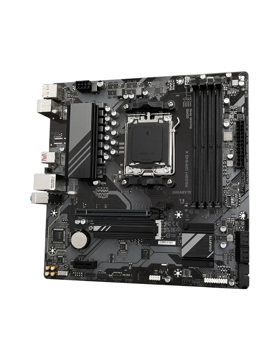 Gigabyte A620M GAMING X. Fabricante de procesador: AMD, Socket de procesador: Zócalo AM5, Procesador compatible: AMD Ryzen™ 5, AMD Ryzen 7 7th Gen, AMD Ryzen 9 7th Gen. tipos de memoria compatibles: DDR5-SDRAM, Memoria interna máxima: 192 GB, Tipo de ranuras de memoria: DIMM. Interfaces de disco de almacenamiento soportados: M.2, SATA III, Tipos de unidades de almacenamiento admitidas: HDD & SSD, Niveles RAID: 0, 1, 10. Máxima resolución: 4096 x 2160 Pixeles. Conector USB: USB tipo A, USB Tipo C