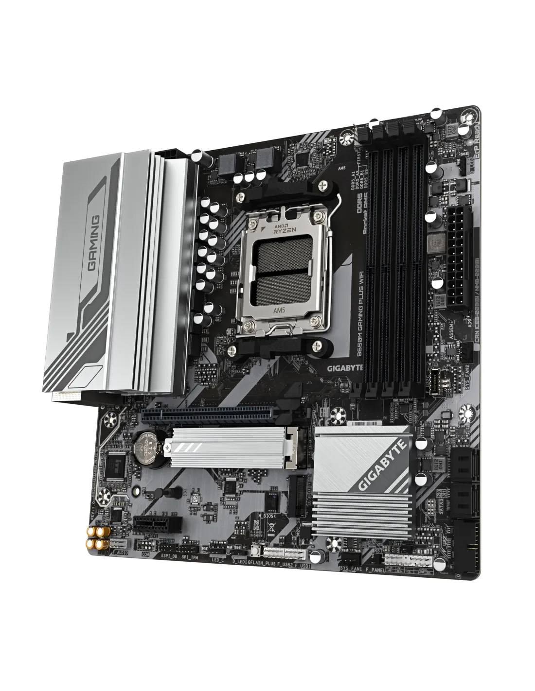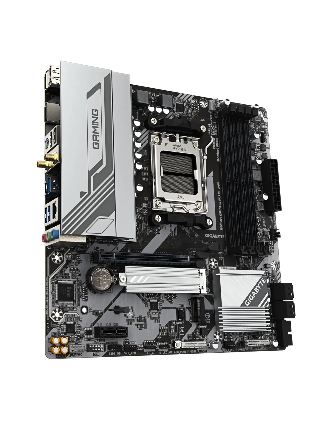 Características de la GIGABYTE B650M Gaming Plus WiFi DDR5La GIGABYTE B650M Gaming Plus WiFi es una placa base Micro-ATX diseñada para quienes buscan montar un PC de alto rendimiento con procesadores AMD Ryzen de nueva generación y memoria DDR5 de alta velocidad. Ideal para entusiastas del gaming, creadores de contenido o usuarios que quieren una base sólida y preparada para el futuro. Incluye Wi-Fi 6E, Bluetooth 5.3 y soporte PCIe 4.0, todo con un diseño robusto y una conectividad moderna.Compatibilidad con AMD Ryzen y DDR5 de alta velocidadPreparada para la última generación de procesadores, esta placa base soporta sockets AM5 y procesadores AMD Ryzen Series 7000, 8000 y 9000. Su arquitectura permite aprovechar al máximo las ventajas de la memoria DDR5 de hasta 8000 MHz, garantizando un rendimiento superior y una gran capacidad de multitarea.Socket: AM5 compatible con Ryzen 7000/8000/9000Soporte de memoria DDR5 hasta 8000 MHz (OC)4 ranuras DIMM, hasta 256 GB totalesConectividad total con Wi-Fi 6E y 2.5 GbEIncorpora conectividad inalámbrica de última generación con Wi-Fi 6E (802.11ax) y Bluetooth 5.3, ideal para conexiones rápidas y estables. Además, su puerto Ethernet de 2.5 Gigabit ofrece gran ancho de banda para gaming online o trabajo en red intensivo.Wi-Fi 6E + Bluetooth 5.3 integradosControlador LAN Realtek RTL8125 (2.5 GbE)2 conectores de antena Wi-Fi incluidosAlmacenamiento ultrarrápido y ampliableCon 2 ranuras M.2 PCIe 4.0 y soporte para RAID 0, 1 y 10, esta placa permite montar sistemas de almacenamiento de alto rendimiento y gran fiabilidad. Además, cuenta con 4 puertos SATA III para unidades HDD o SSD adicionales.2 ranuras M.2 (hasta 22110 y 2580)Interfaz PCIe 4.0 para SSDs NVMe4 puertos SATA III compatibles con RAIDPuertos modernos y salidas de vídeo integradasDispone de una conectividad completa para periféricos y monitores. Ofrece puertos USB 3.2 Gen 1 tipo A y C, HDMI 2.1 y DisplayPort 1.4, permitiendo conectar múltiples pantallas con resoluciones 4K.1 HDMI 2.1 + 2 DisplayPort 1.4USB 3.2 Gen 1: 3x tipo A + 1x tipo C2 puertos USB 2.0 y PS/2 legacyAudio envolvente y componentes de calidadGracias al chip Realtek ALC897 y soporte para audio 7.1 canales, ofrece una experiencia sonora inmersiva. También cuenta con RGB addressable y conexiones para ventiladores, ideal para configuraciones personalizadas y refrigeración eficiente.Audio 7.1 canales con Realtek ALC8973 conectores RGB + 2 para ventiladores de chasisMonitoreo de voltaje, temperatura y ventiladorDiseño robusto y BIOS avanzadaCuenta con una BIOS UEFI de 256 MB, soporte para actualizaciones y gestión fácil desde su interfaz intuitiva. Su formato microATX facilita el montaje en torres compactas sin sacrificar prestaciones.BIOS UEFI AMI de 256 MBClear CMOS jumper y compatibilidad SMBIOS 2.7Factor de forma: Micro ATX (244 x 244 mm)Otras especificacionesChipset: AMD B650Tipo de alimentación: ATXPeso: 1,44 kgColor: Marrón oscuroSistema operativo soportado: Windows 10/11 x64Refrigeración pasivaContenido de la caja: antena Wi-Fi, tornillos, pila CR2032, software Norton OEMGarantía del fabricante: 3 años